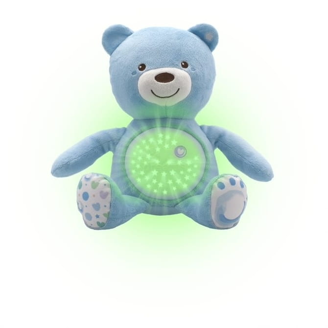 Medvedík s projektorom zo série Chicco First Dreams je plyšová, mäkučká hračka so skrytým mechanizmom v brušku, ktorý premieta farebné hviezdičky a prehráva až 30 minút zvukových efektov, ako sú: klasická hudba (Bach a Beethoven), jazz, soft rock, New Age a zvuky prírody.