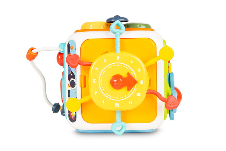 Senzorická kocka podporuje logické myslenie dieťaťa prostredníctvom hry s dvoma rôznymi sortérmi. Jedna zo stien je vybavená štyrmi elastickými šnúrkami, cez ktoré môže dieťa prevliekať a vhadzovať kocky – je to skvelé cvičenie pre prsty, rozvíjajúce presnosť pohybu a trpezlivosť. Druhá stena obsahuje klasický sortér s rôznymi tvarmi, ktorý učí rozpoznávať tvary, logicky myslieť a priraďovať prvky.