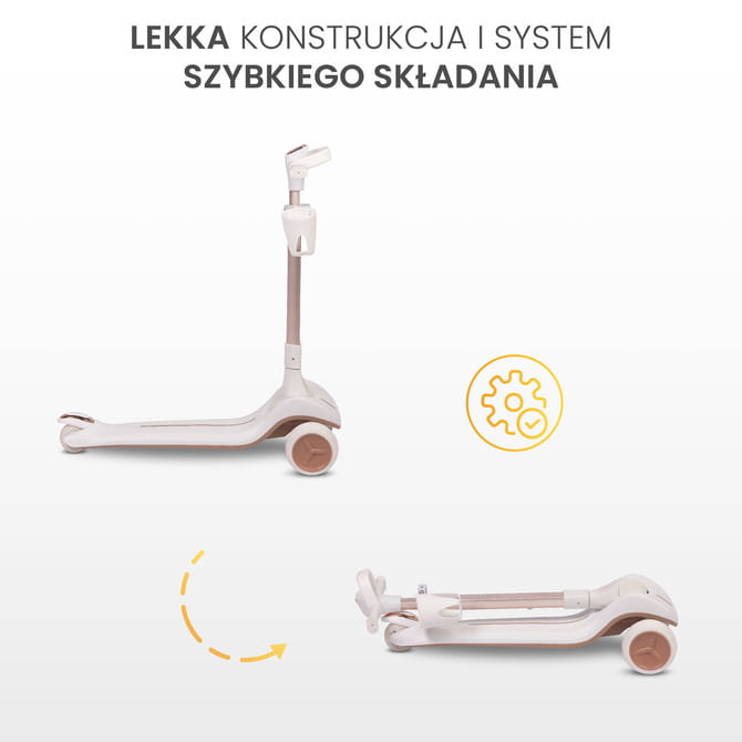 S ohľadom na najmladších používateľov bola vytvorená kolobežka s ľahkou konštrukciou, čo uľahčuje dieťaťu samostatné manévrovanie a prenášanie. Rýchly skladací systém umožňuje zloženie kolobežky jedným pohybom, čo je ideálne riešenie pre tých, ktorí často cestujú.