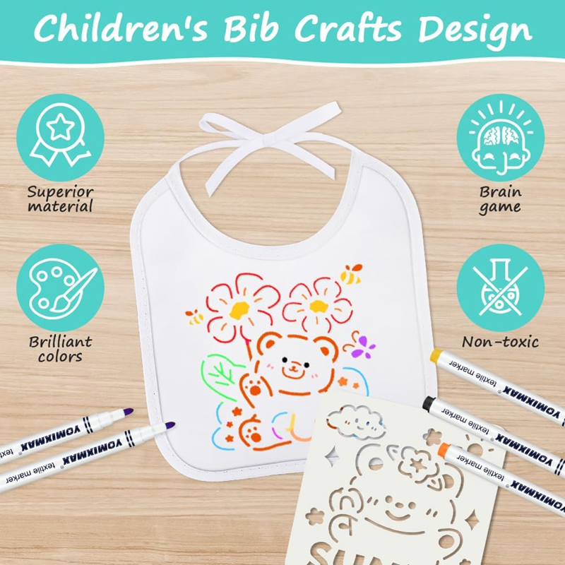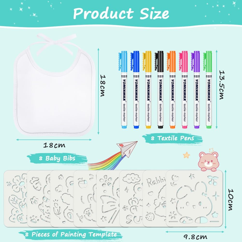 Objavte kreatívnu sadu, ktorá spája zábavu s praktickou ochranou oblečenia. V balení nájdete 8 bielych podbradníkov, 8 kvalitných textilných fixiek a 8 šablón na jednoduché kreslenie. Je to jednoduchý spôsob, ako spolu s dieťaťom vytvoriť jedinečné, personalizované podbradníky – bez stresu z výtvarných zručností.