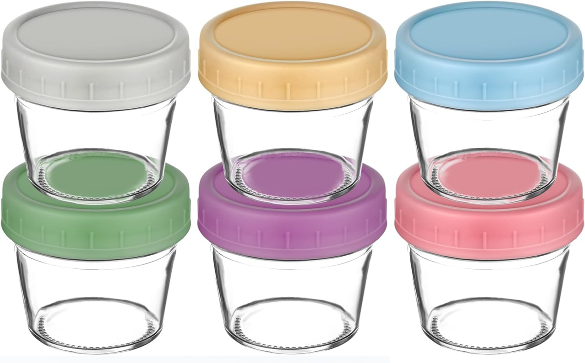 Plánujte jedlá vopred a udržujte poriadok v kuchyni. 12 sklenených pohárov po 100 ml s farebnými viečkami je ideálnych na prípravu, porciovanie, skladovanie a podávanie domácich pyré, kaší a snackov.