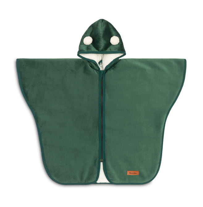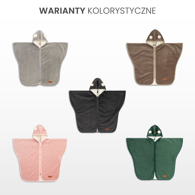 Auto pončo je vynikajúcou náhradou za bundu v aute. Obyčajná bunda často spôsobuje, že bezpečnostné pásy neposkytujú správne upevnenie dieťaťa v autosedačke. S použitím ponča ľahšie zabezpečíte správne zapnutie pásov. Obojstranný zips s ochranou proti podráždeniu a magnety pod pazuchami umožňujú rýchle obliekanie a vyzliekanie ponča. Teplo zabezpečujú dve esteticky spojené vrstvy hrubého a príjemného plyšu. Pončo môže slúžiť aj ako bežná bundička na chladnejšie jarné a jesenné dni.