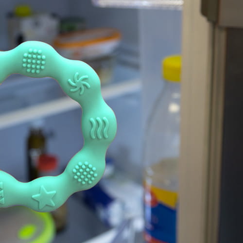 Materiál, z ktorého je hryzátko Babyono RING vyrobené, umožňuje zníženie jeho teploty v chladničke pre dodatočné upokojenie dieťaťa.