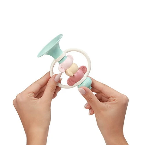 Pri potriasaní hrkalkou jej farebné krúžky vydávajú zvuky, ktoré priťahujú pozornosť dieťaťa a rozvíjajú jeho sluch.