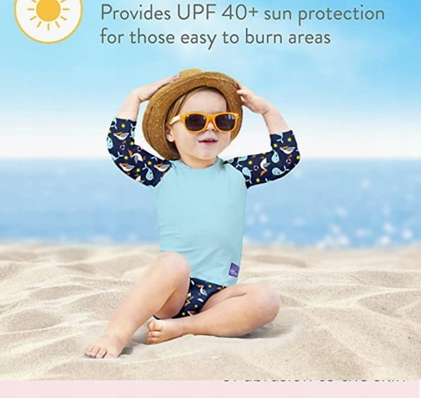- Má index UPF50+ (Index UPF [Ultraviolet Protection Factor] je v tkaninách to, čo SPF [Sun Protection Factor] v kozmetike. Chráni pokožku pred ultrafialovým žiarením tým, že ho odráža.) Chráni ramená a citlivé oblasti na detskej pokožke, čo umožňuje užívať si zábavu na pláži bez obáv z negatívnych účinkov slnečného žiarenia.
