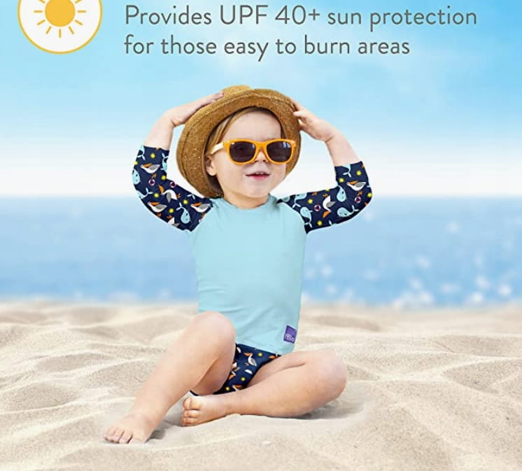 - Má index UPF50+ (Index UPF [Ultraviolet Protection Factor] je v textíliách to, čo SPF [Sun Protection Factor] v kozmetike. Chráni pokožku pred ultrafialovým žiarením tým, že ho odráža.) Chráni ramená a citlivé oblasti pokožky dieťaťa, čo umožňuje užívať si zábavu na pláži bez obáv z negatívnych účinkov slnečného žiarenia.