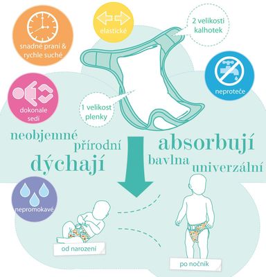 - Nie je potrebné meniť pri každom prebaľovaní, preto postačujú 3 alebo 4 obaly danej veľkosti. Dve veľkosti 1 (do 9 kg) a 2 (9 kg+ do konca plienkovania) zabezpečujú presné priliehanie, a tým aj tesnosť. Zabraňujú pretekaniu. Vnútorná strana obalu je pokrytá nepriepustnou vrstvou mäkkého a tenkého PULu.
