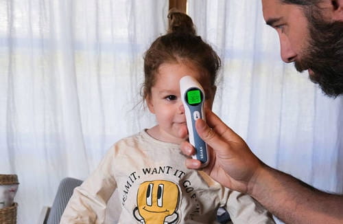 - Farebný kód: zelená obrazovka pre teploty od 35°C do 37,5°C, červená pre teploty medzi 37,6°C a 42°C.