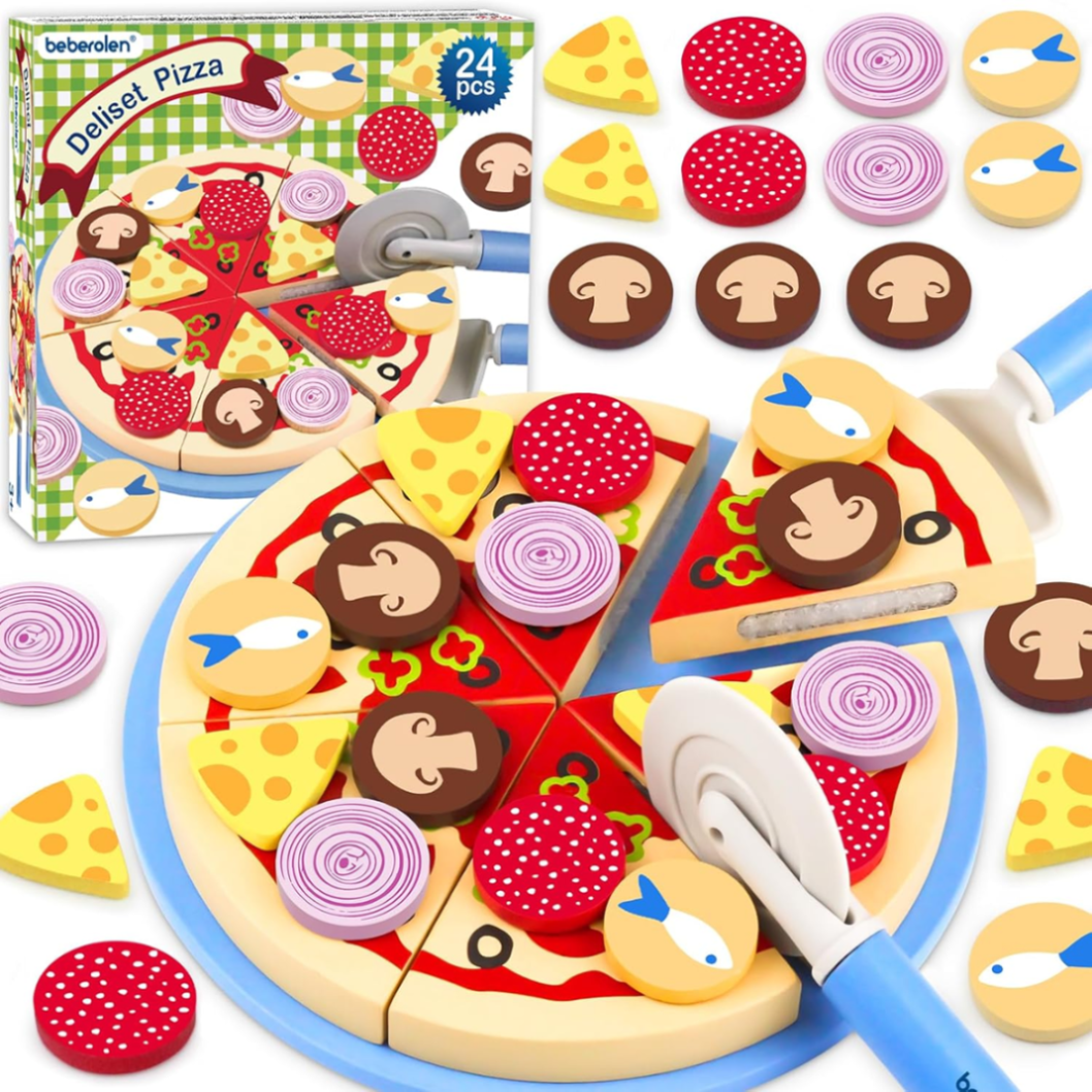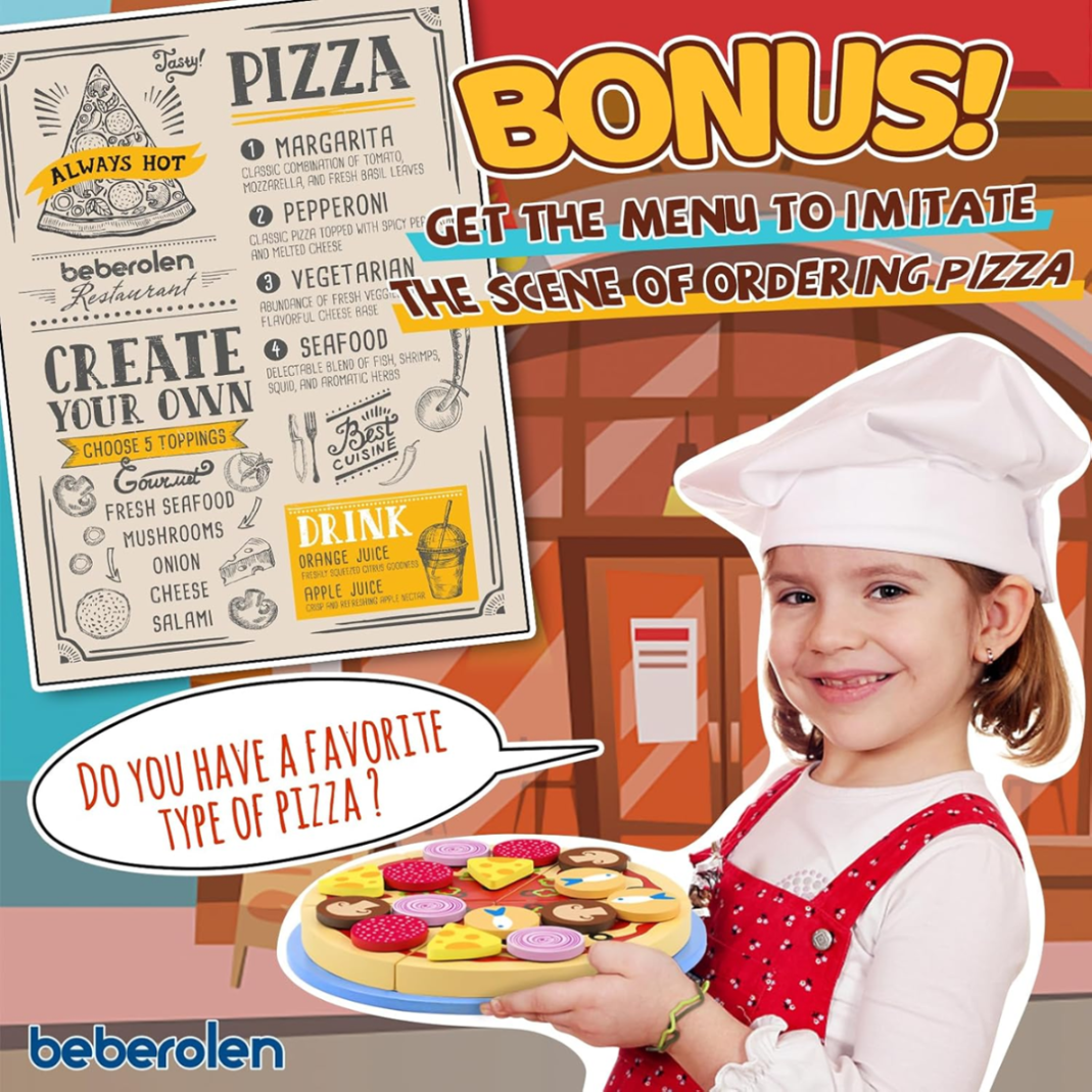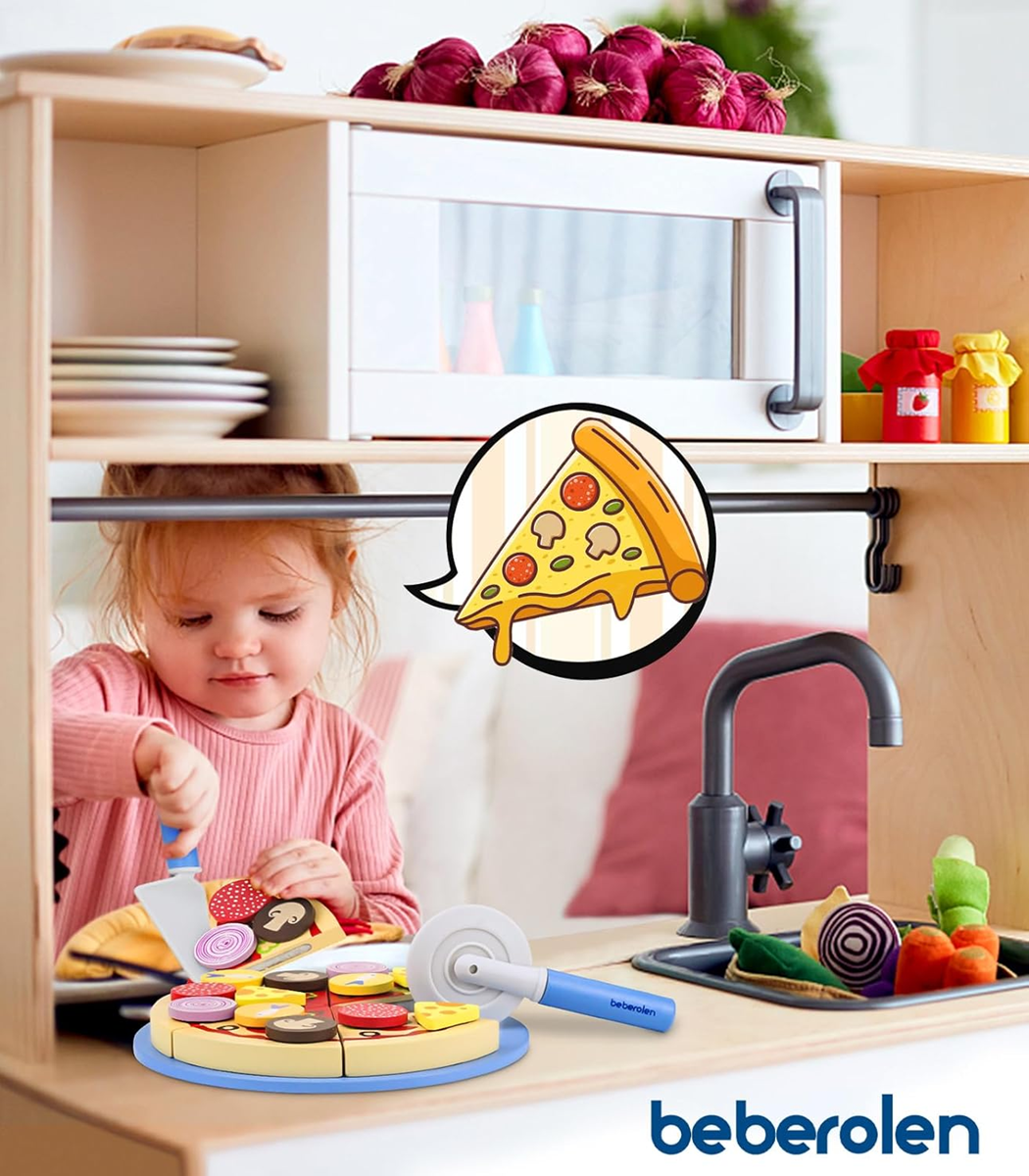 - ? Drevená sada na pizzu: Kuchynská sada pre deti Beberolen obsahuje 24 drevených doplnkov, vrátane 6 kúskov pizze, 15 príloh, 1 nôž na pizzu, 1 špachtľu, 1 tácku. Tieto kuchynské hračky s tematikou pizze sú ideálne pre deti na učenie sa hrou.
