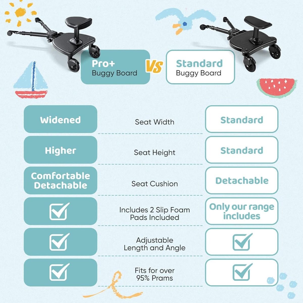 - 3 v 1 doska na prechádzky – táto doska ku kočíku umožňuje dieťaťu stáť alebo sedieť. Doska môže byť zavesená na rukoväť kočíka, keď sa nepoužíva. Je kompatibilná s viac ako 95 % modelov, vrátane ľahkých, trojkolesových a dáždnikových kočíkov, ale nie je vhodná pre modely kočíkov, ktoré sú príliš ľahké alebo príliš úzke. Je to ideálne riešenie pre rodiny s dvoma deťmi a uľahčuje cestu do nákupného centra, do parku alebo na cestovanie.