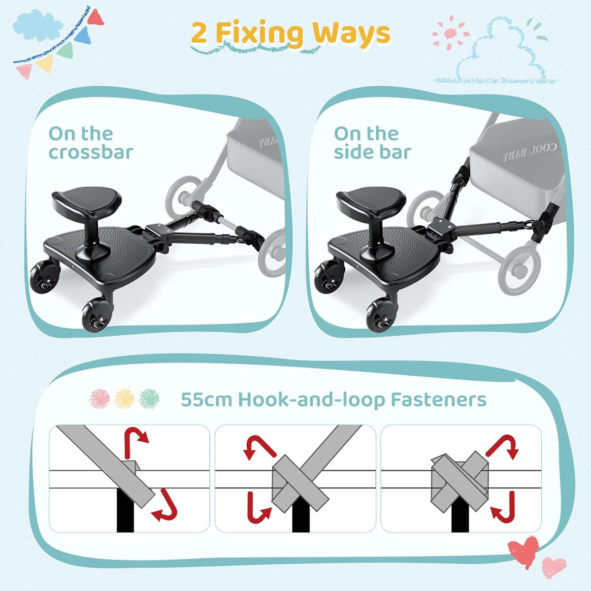 - Regulovateľná doska ku kočíku je vybavená rámom s 3 nastaviteľnými dĺžkami (25,5 cm / 27,75 cm / 30 cm), aby sa prispôsobila vzdialenosť medzi doskou a kočíkom. Pomocou 2 otočných gombíkov je možné nastaviť výšku podnožky (-180°~110°), aby sa prispôsobila rôznym výškam kočíka. Doska ku kočíku je odnímateľná.