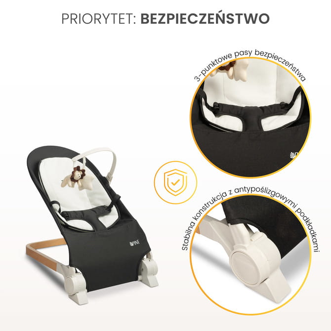 Lehátko PINE je synonymom bezpečnosti a pohodlia. Je vybavené 3-bodovými bezpečnostnými pásmi, ktoré poskytujú úplnú ochranu dieťaťa. Stabilitu zaručuje pevná konštrukcia s protišmykovými podložkami, vďaka čomu je každý pohyb bezpečný a tichý.