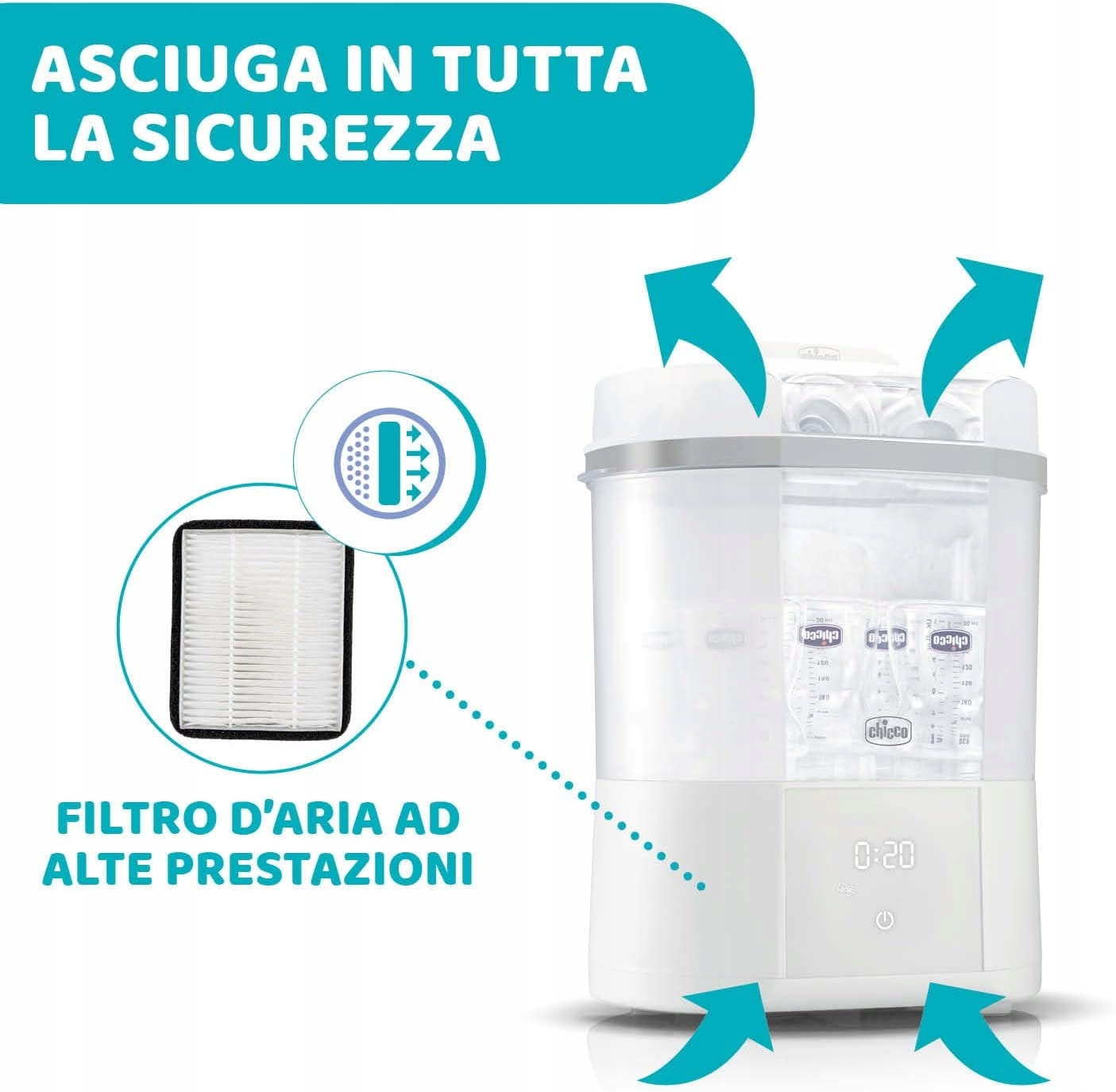 - Bezpečné sušenie vďaka vysokovýkonnému filtru, ktorý účinne zachytáva malé častice prachu a nečistôt**. Navyše eliminuje kondenzáciu a všetku vlhkosť prítomnú vo fľaši po sterilizácii. Upozornenie na odvápnenie pripomína potrebu čistenia a odvápnenia produktu po niekoľkých cykloch. *Okrem času nahrievania. ** Zachytáva až 98% častíc prítomných vo vzduchu. Účinnosť filtra klesá časom, vymeňte ho, keď sa rozsvieti ikona výmeny filtra. EFEKTÍVNY: eliminuje 99,9% škodlivých baktérií. FUNKCIA SUŠENIA: fľaše suché a pripravené na použitie. PRIESTRANNÝ: zmestí až 6 fliaš NaturalFeeling. 2 KONFIGURÁCIE: plnohodnotná a kompaktná verzia. HYGIENICKÝ: pokročilý filter pre väčšiu bezpečnosť. 24h OCHRANA: pri zatvorenom veku zostávajú príslušenstvo dezinfikované. BEZPEČNÝ: automatické vypnutie po ukončení cyklu. JEDNODUCHÉ ČISTENIE: keramický povrch. PRAKTICKÝ: automatické pripomenutie potreby odvápnenia a výmeny filtra. ODLOŽENIE ŠTARTU PROGRAMU: až do 2 hodín. DIGITÁLNY DISPLEJ: praktický a prehľadný LCD displej.