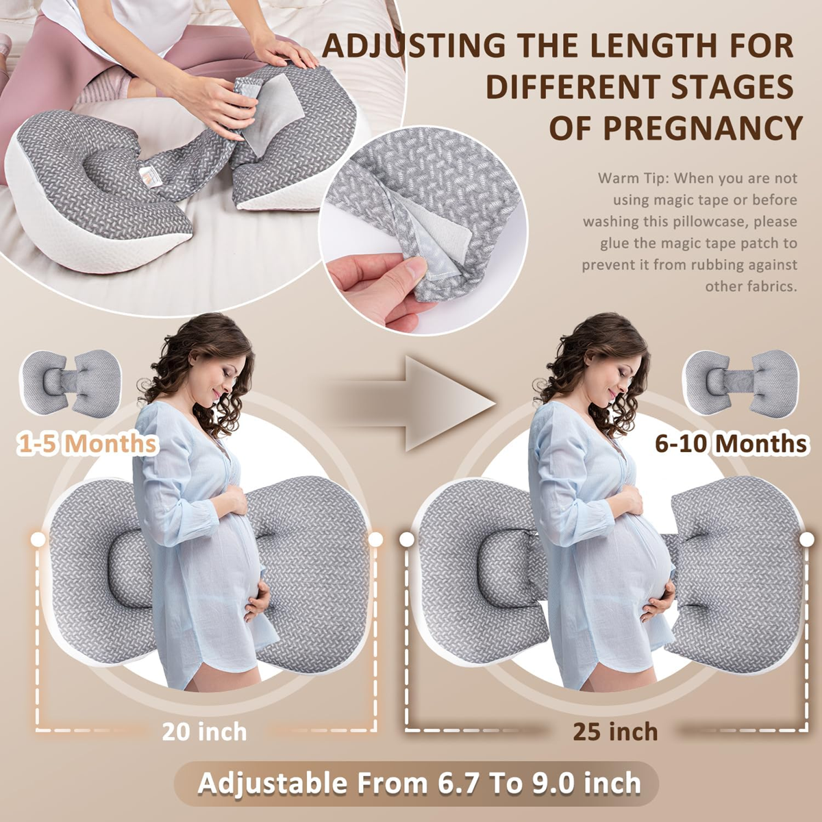 - Elastický a prispôsobivý: výplň je možné ľubovoľne upraviť pre individuálne pohodlie pri používaní. Náš tehotenský vankúš pre spanie na boku využíva lepiace spojenie, ktoré umožňuje flexibilné nastavenie vzdialenosti medzi dvoma klinovými vankúšmi, aby vyhovoval potrebám rôznych tehotných žien.