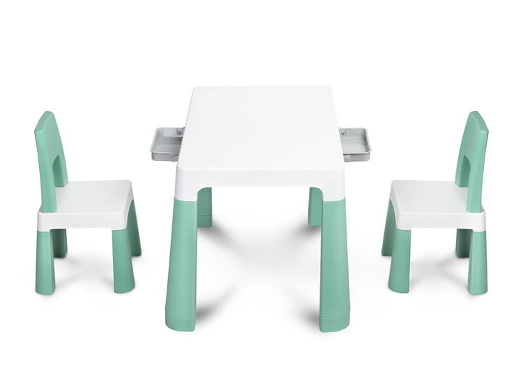Súprava nábytku je vyrobená z vysoko kvalitného plastu – bezpečného, odolného voči poškriabaniu a ľahkého. To umožňuje dieťaťu jednoducho prenášať stôl a stoličky kamkoľvek.