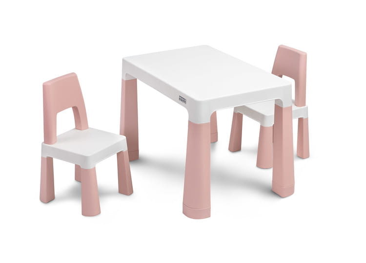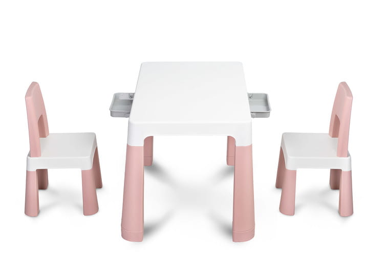 Súprava nábytku je vyrobená z vysoko kvalitného plastu – bezpečného, odolného voči poškriabaniu a ľahkého. To umožňuje dieťaťu jednoducho prenášať stôl a stoličky kamkoľvek.