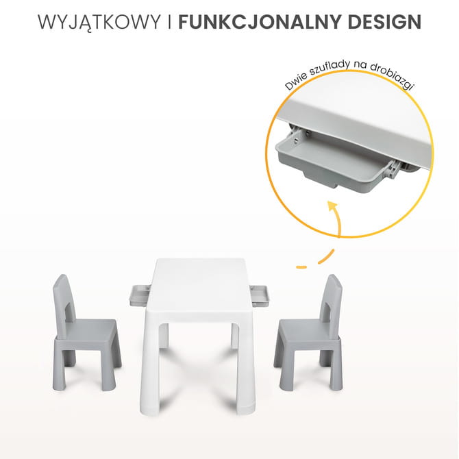 Monti je všestranný detský stolík so stoličkami. S jeho pomocou ľahko vytvoríte kútik na umelecké práce alebo hranie doma aj vonku. Súprava je vyrobená z vysoko kvalitného plastu – bezpečného a odolného voči rozmarom počasia aj divokej hre. Stôl a stoličky sú ľahké, takže ich dieťa môže samostatne prenášať. Vďaka jednoduchej konštrukcii sa Monti ľahko skladá – stačí spojiť jednotlivé diely na zacvaknutie. Stôl má 2 zásuvky ukryté pod doskou a možnosť zníženia výšky o 6 cm.