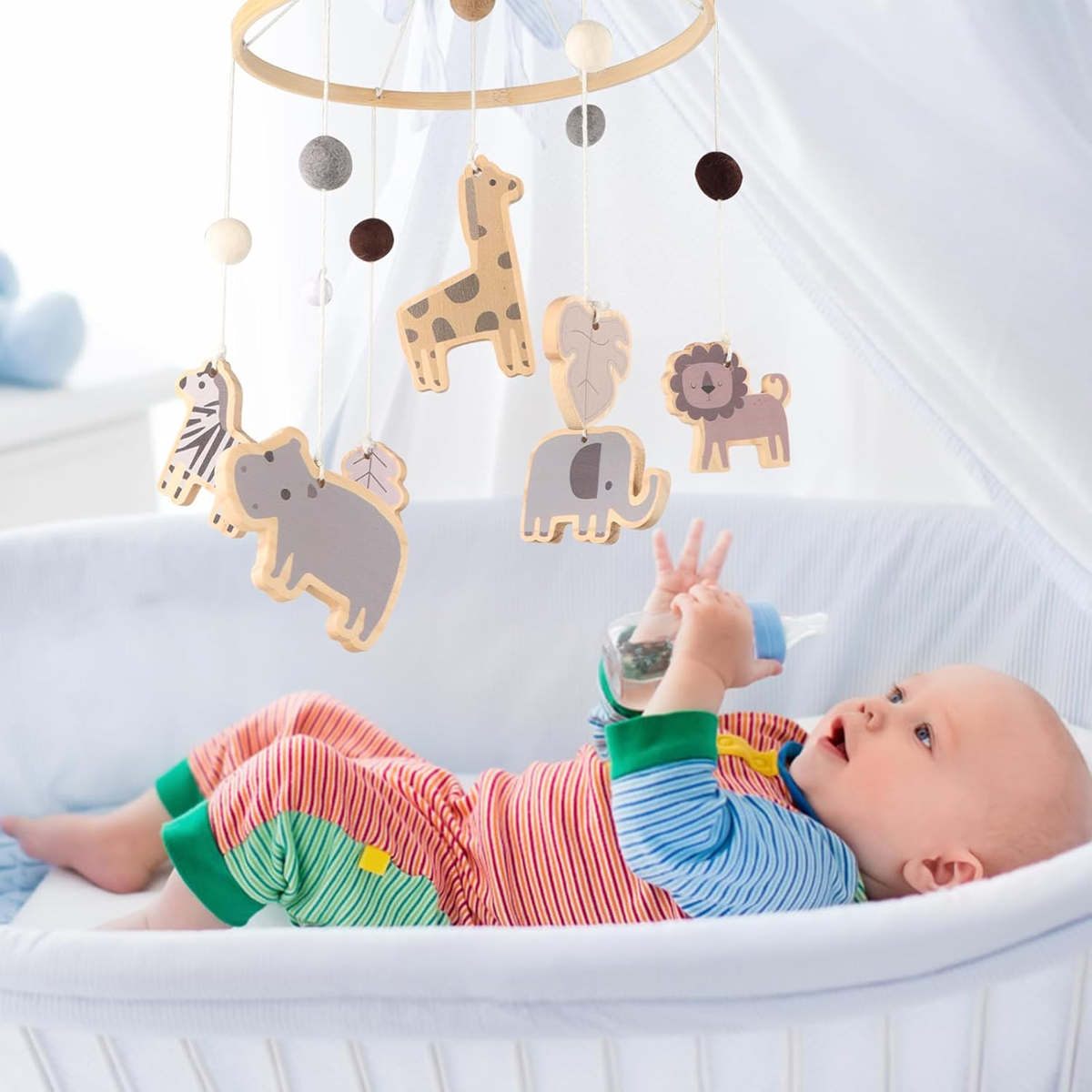 - Unikátny a minimalistický dizajn: plstené guličky sú vysokej kvality a nezamotávajú sa medzi sebou. Poskytujú bábätkám vizuálnu stimuláciu s hĺbkou. Prírodná, upokojujúca farba poskytuje dostatočný záujem pre novorodencov, ale neprebúdza ich. Zároveň jasné farby môžu vizuálne stimulovať dieťa a prebúdzať jeho zvedavosť, rozvíjať jeho vizuálnu schopnosť rozlišovať farby.