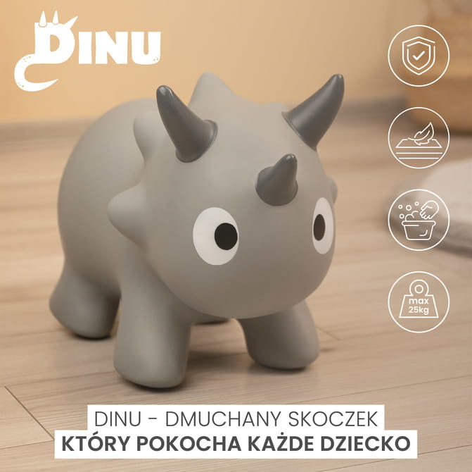 Spoznajte Dinu - nafukovacie skákadlo v tvare roztomilého triceratopsa, ktoré prinesie deťom veľa radosti a pohybu. Dinu je ideálny spôsob na aktívnu zábavu a podporu rozvoja pohybovej koordinácie najmenších.
