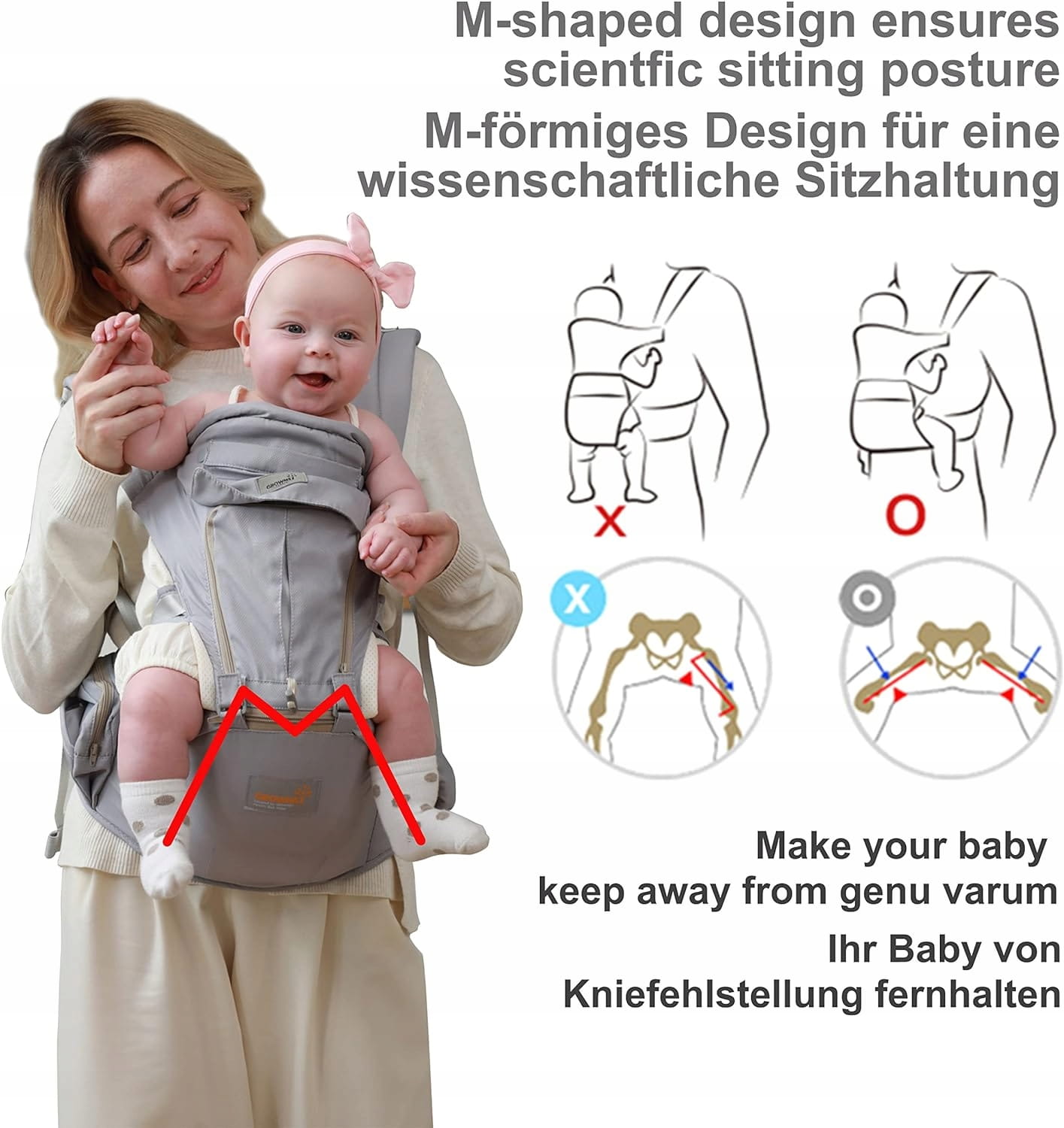 - Ergonomický dizajn - detské nosidlo pre všetky ročné obdobia s nastaviteľným vedierkovým sedadlom podporuje dieťa v ergonomickom prirodzenom tvare M vo všetkých polohách dieťaťa. Nastaviteľné ramenné popruhy a bedrový pás na prenesenie hmotnosti na boky pre pohodlné nosenie. Bedrový pás je možné nastaviť na 60-130 cm.