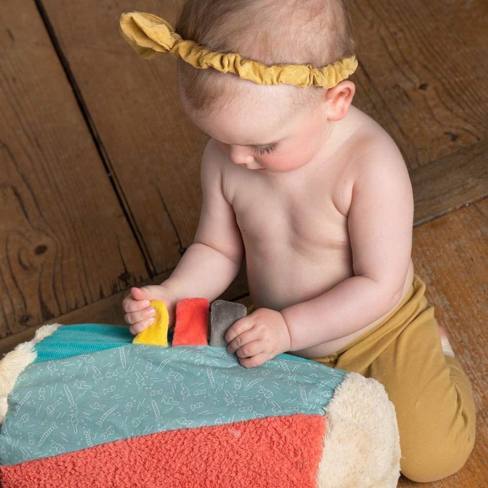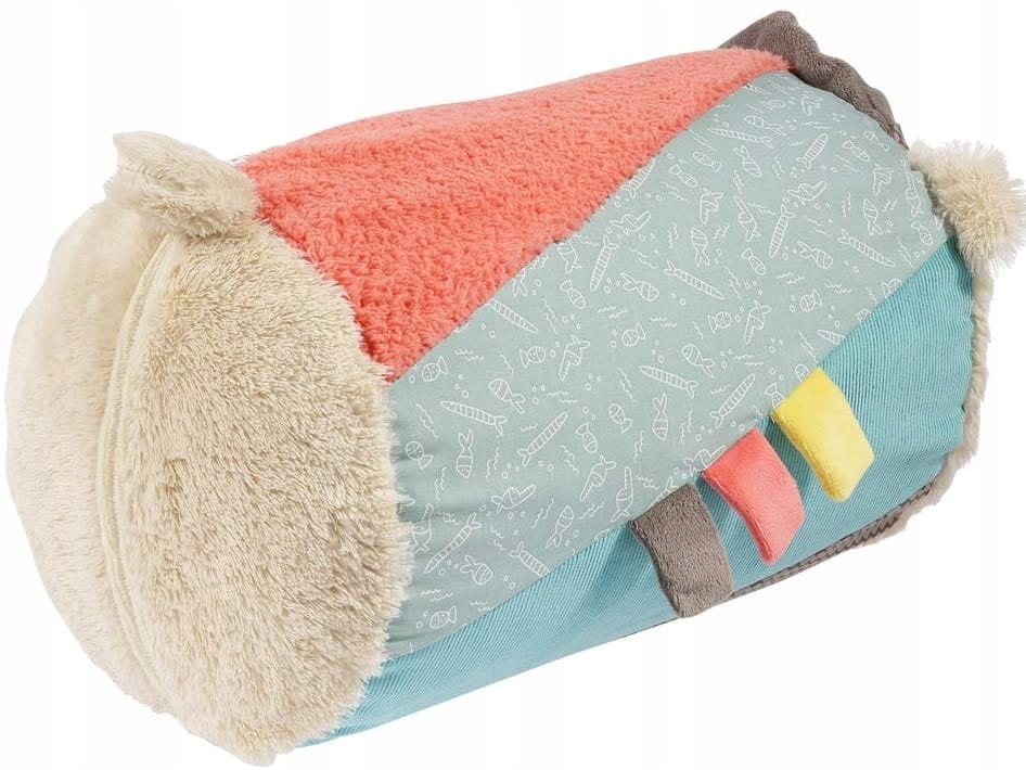 - Hračka stimuluje zmysly zraku, sluchu a hmatu vďaka farebným prvkom, hrkálke a príjemnému materiálu na dotyk.