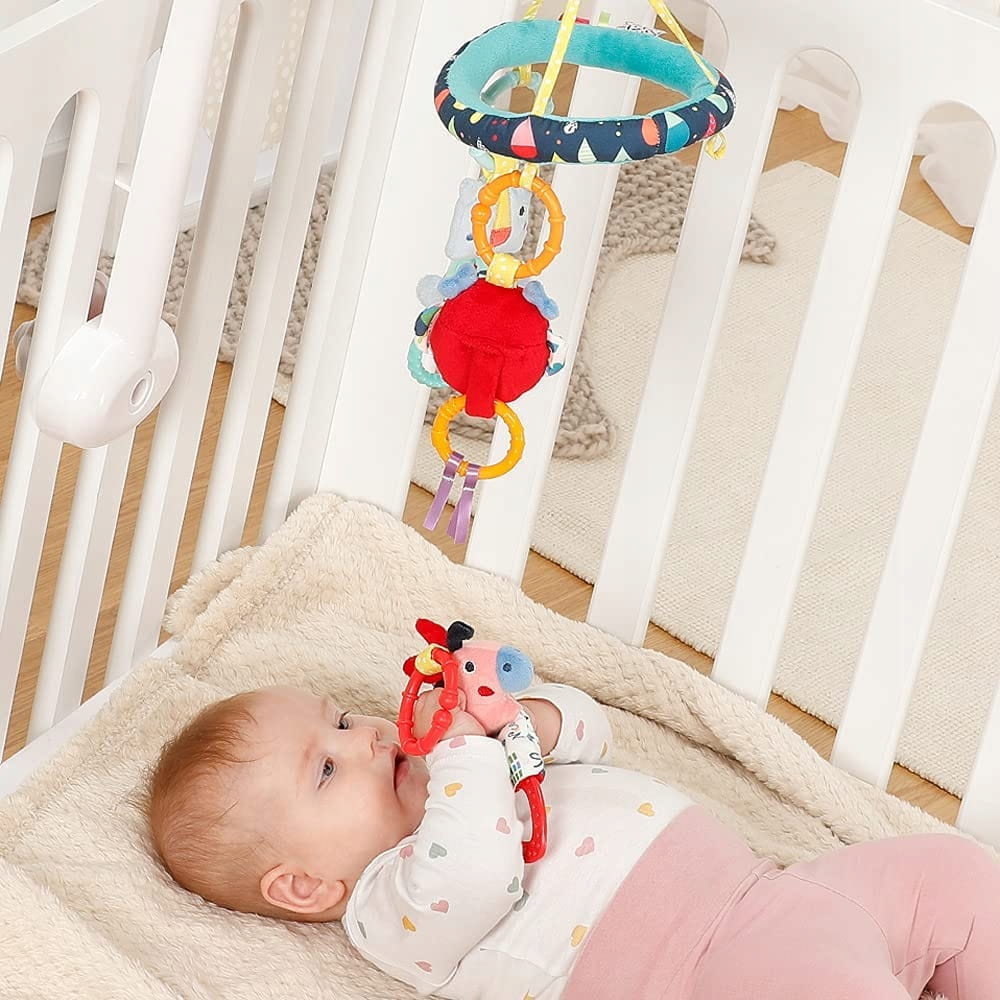 - Farebný kolotoč je vybavený zrkadielkom, úchytkami a hryzátkom.