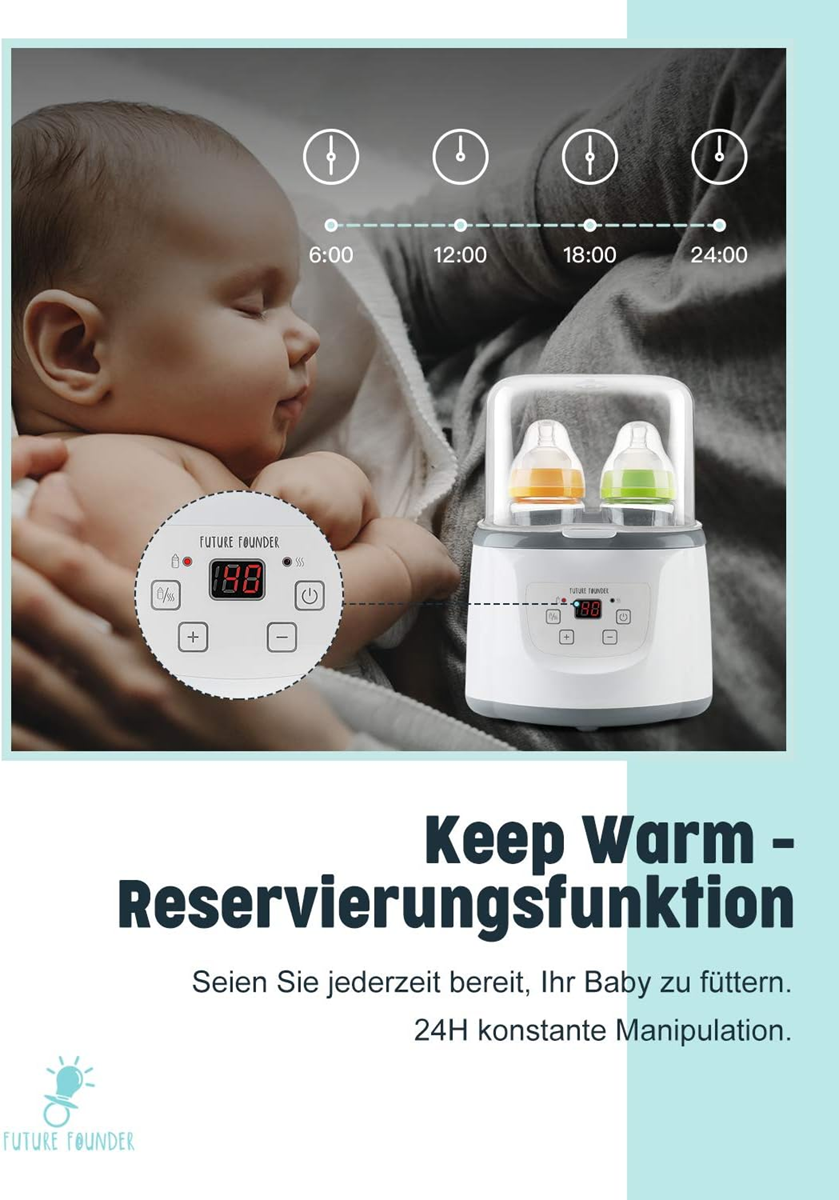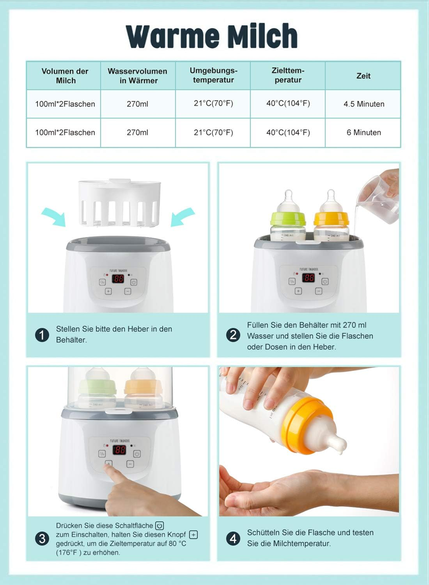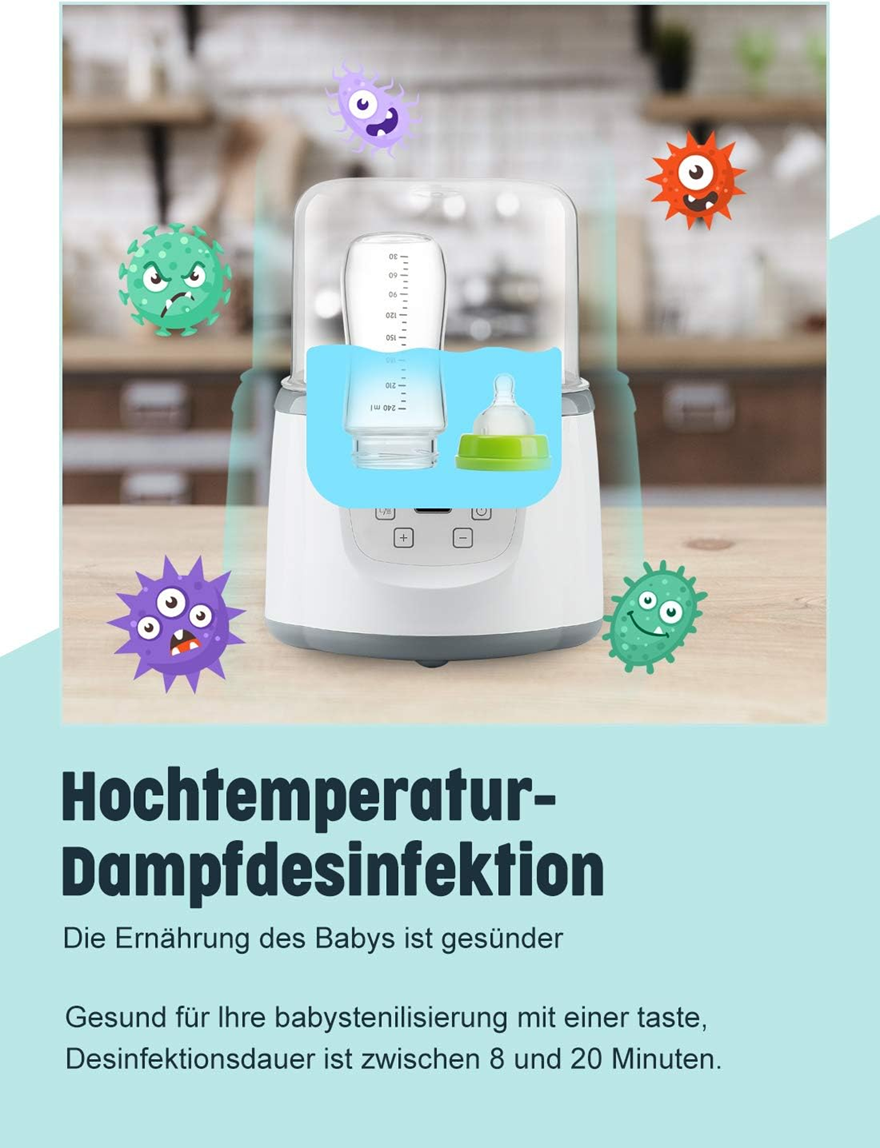 - ? Parná sterilizácia pri vysokej teplote: 100°C parné ohrievanie a sterilizácia, redukuje baktérie, dezinfikuje fľaše a cumlíky a chráni dieťa pred baktériami. Nemusíte sa obávať o bezpečnosť, pretože inteligentný ohrievač fliaš má funkciu automatického vypnutia pri prehriatí.