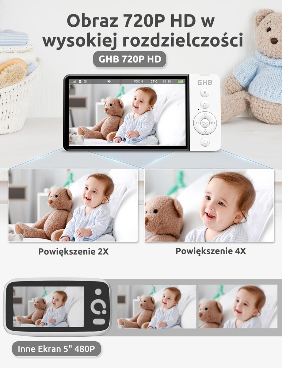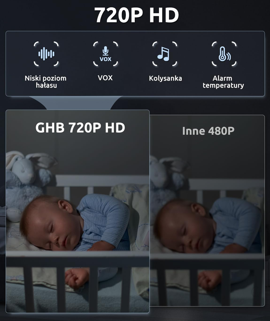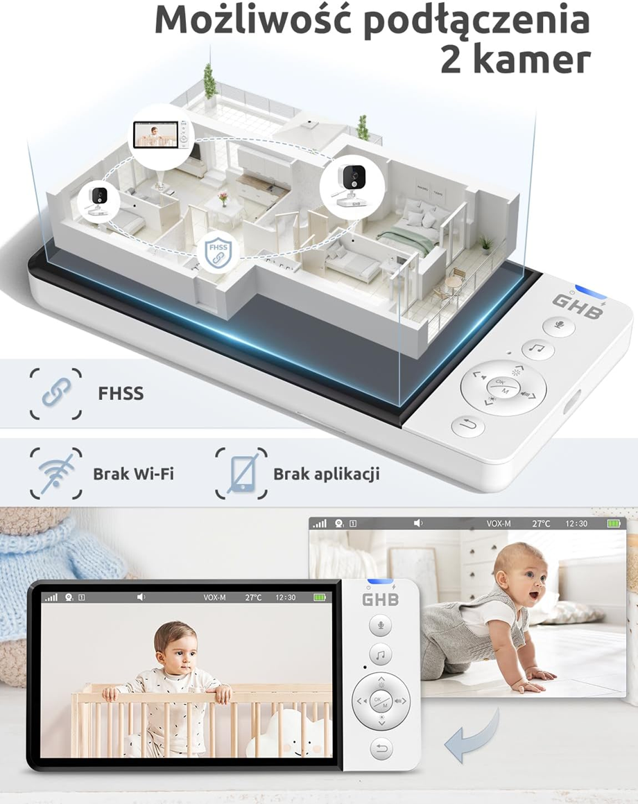 Pokoj bez aplikácie a Wi-Fi. Tento monitor pre bábätká spája kameru s 5-palcovým HD 720p displejom (IPS, 180° uhol pohľadu) a bezpečným pripojením FHSS 2,4 GHz. Získate stabilný obraz v reálnom čase, dlhú výdrž batérie a funkcie, ktoré uľahčujú starostlivosť cez deň aj v noci.