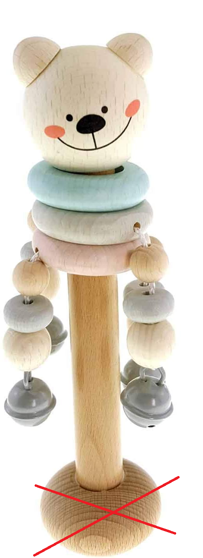 - Hračka je vybavená zvončekmi, klopkajúcimi korálkami a otočnými krúžkami.
