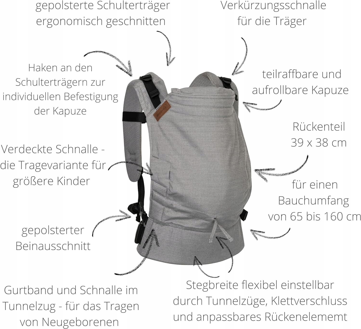 - Optimálne rastie s dieťaťom: zadná časť nosiča je nastaviteľná na dĺžku a šírku. Aby bol čo najmenší tlak na citlivý chrbát dieťaťa, ramenné popruhy sú najprv pripevnené k bedrovému pásu. Od veku, keď dieťa sedí, je možné použiť pracky skryté v zadnej časti. Zmenené rozloženie hmotnosti odľahčuje ramená.