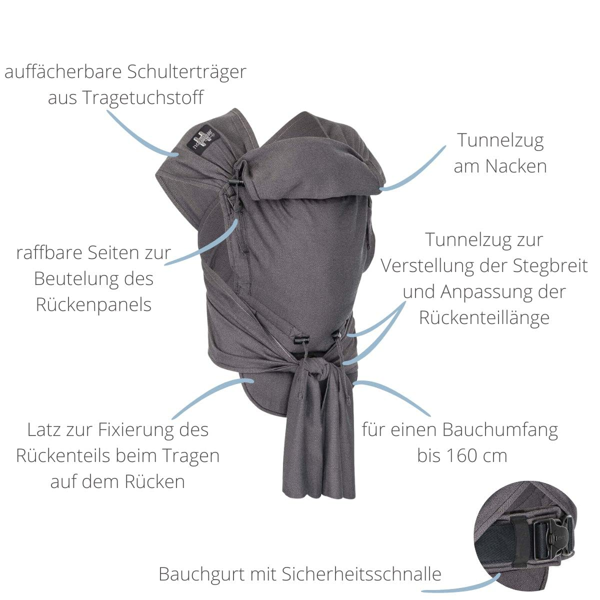 - Iba to najlepšie: zo 100% bavlny. Všetky časti nosidla sú pravidelne kontrolované na obsah škodlivých látok. S úložným vreckom a podrobným ilustrovaným návodom.