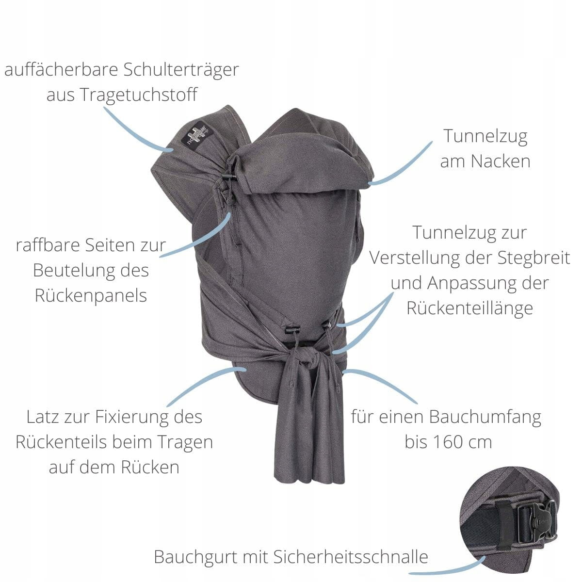 - Iba to najlepšie: zo 100% bavlny. Všetky časti nosiča sú pravidelne kontrolované na obsah škodlivých látok. S vreckom na uskladnenie a podrobným ilustrovaným návodom.