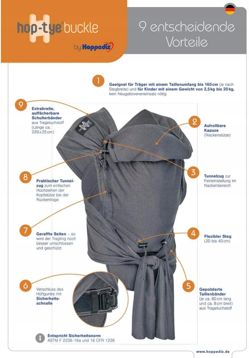 Vyrobené je z veľmi kvalitného materiálu. HOP-TYE® je vyrobený zo 100% bavlny, ktorá úspešne prešla testami na škodlivé látky. Materiál používaný na výrobu nosidiel HOP-TYE® sa používa aj pri výrobe šatiek na nosenie značky Hoppediz.