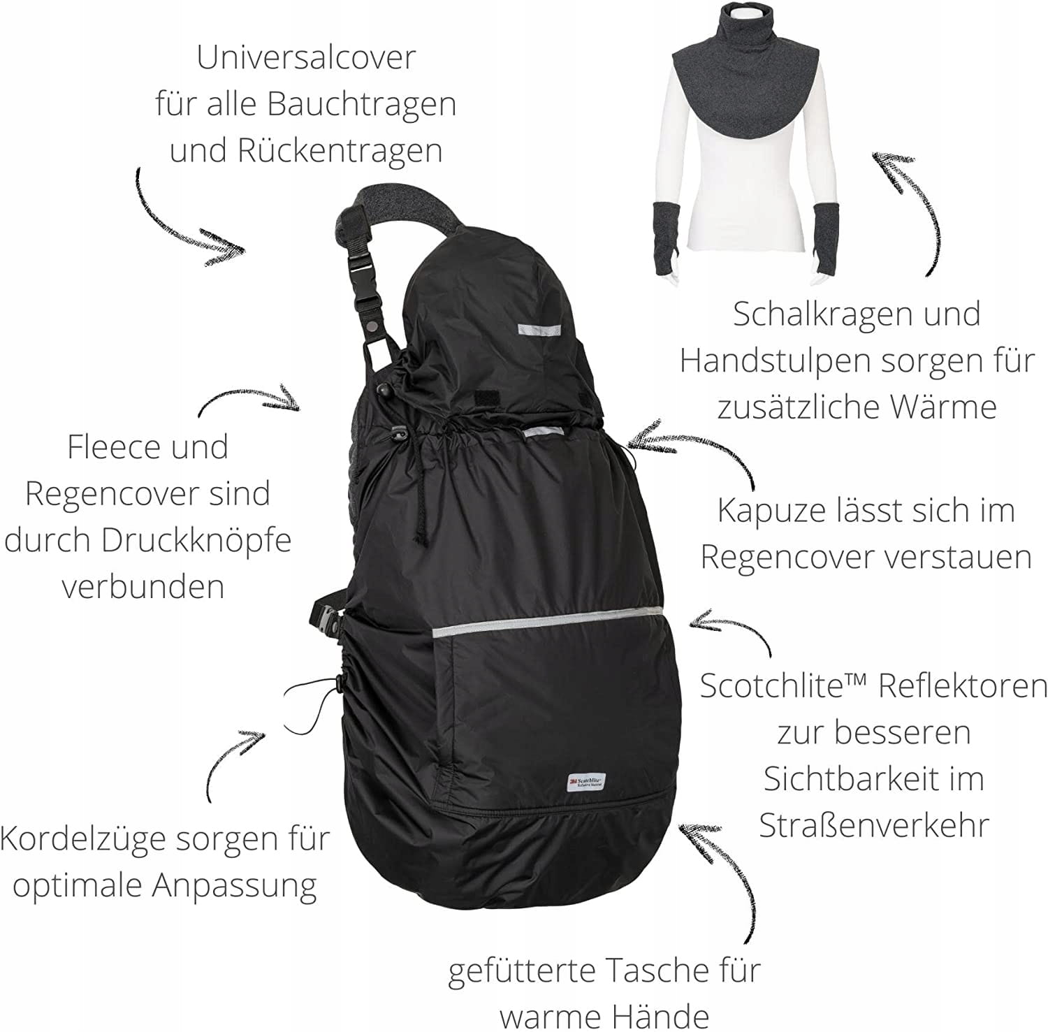 - fleeceový poťah na nosiče s dažďovou ochranou, rukavicami a šálom