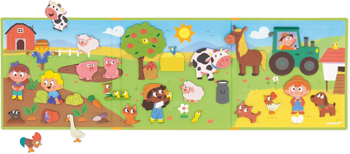 - MAGNETICKÁ KNIHA NA TVORENIE PRÍBEHOV: Vďaka 30 magnetom v tvare postavičiek, hospodárskych zvierat (kôň, krava, ovca...) a dekoratívnych prvkov na umiestnenie na tlačenú scénu si dieťa môže predstaviť úžasné dni na farme na slnku.