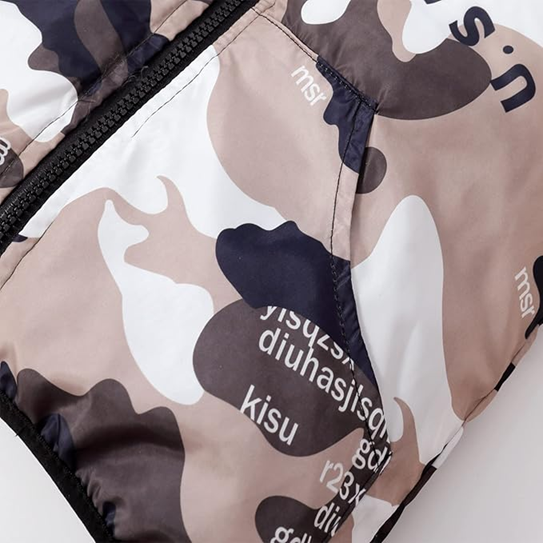 - Obojstranná, dvojvrstvová konštrukcia chrániaca pred vetrom – obojstranná vesta bez rukávov s kapucňou, vo vnútri a zvonku rôzne vzory, pred oblečením maskáč, aby ukázala krásu dieťaťa, obrátené nosenie v jednofarebnom prevedení, aby bolo dieťa energickejšie, ale tiež má dvojvrstvový efekt ochrany pred vetrom. Kapucňa k šatám môže udržať teplo hlavy dieťaťa.