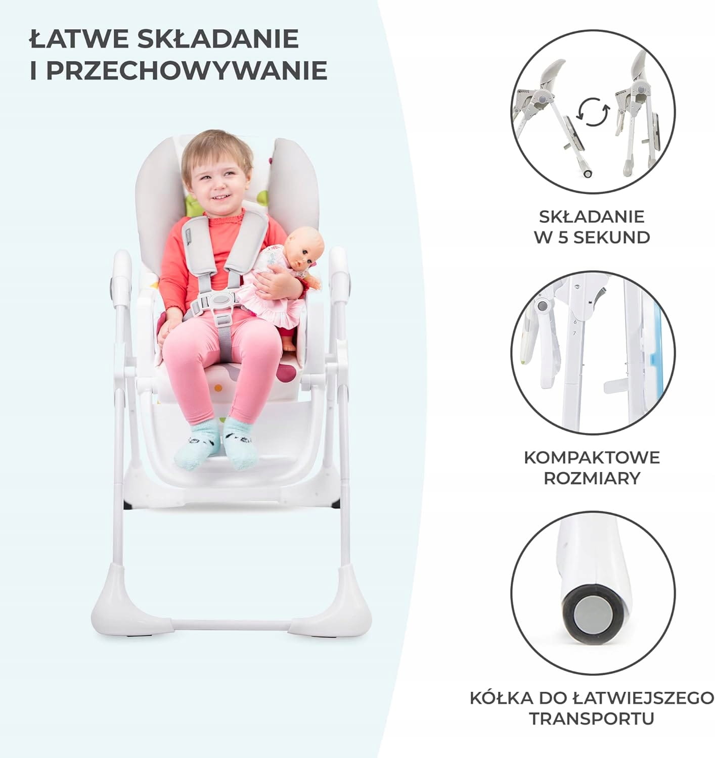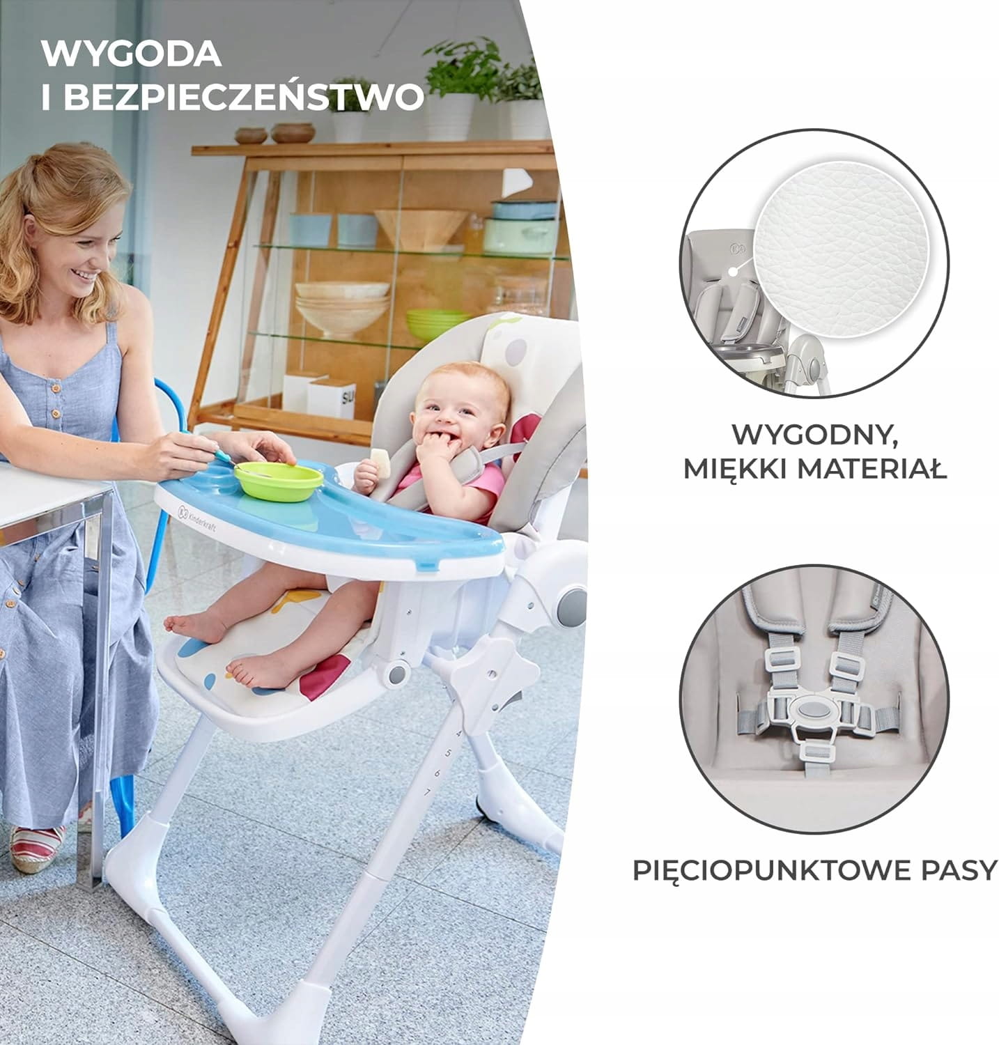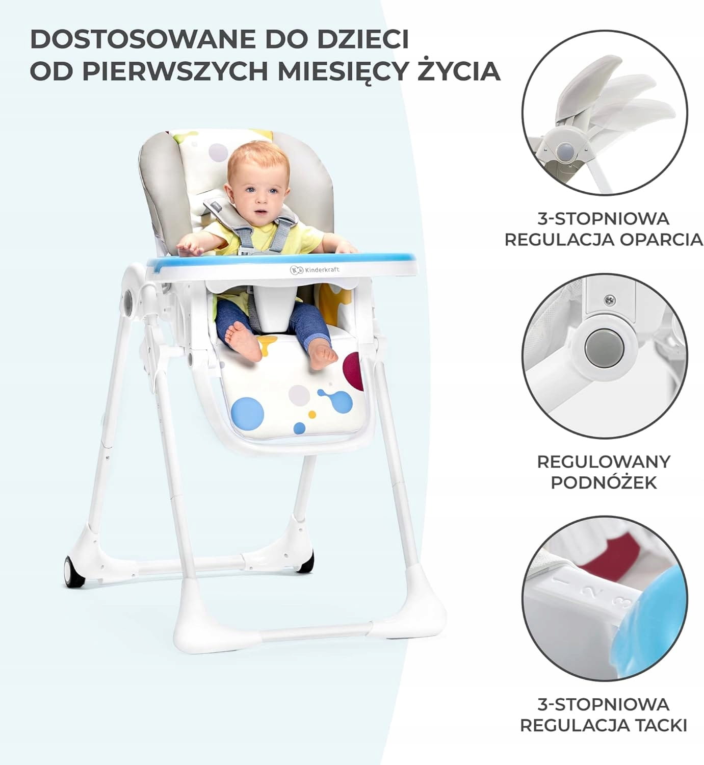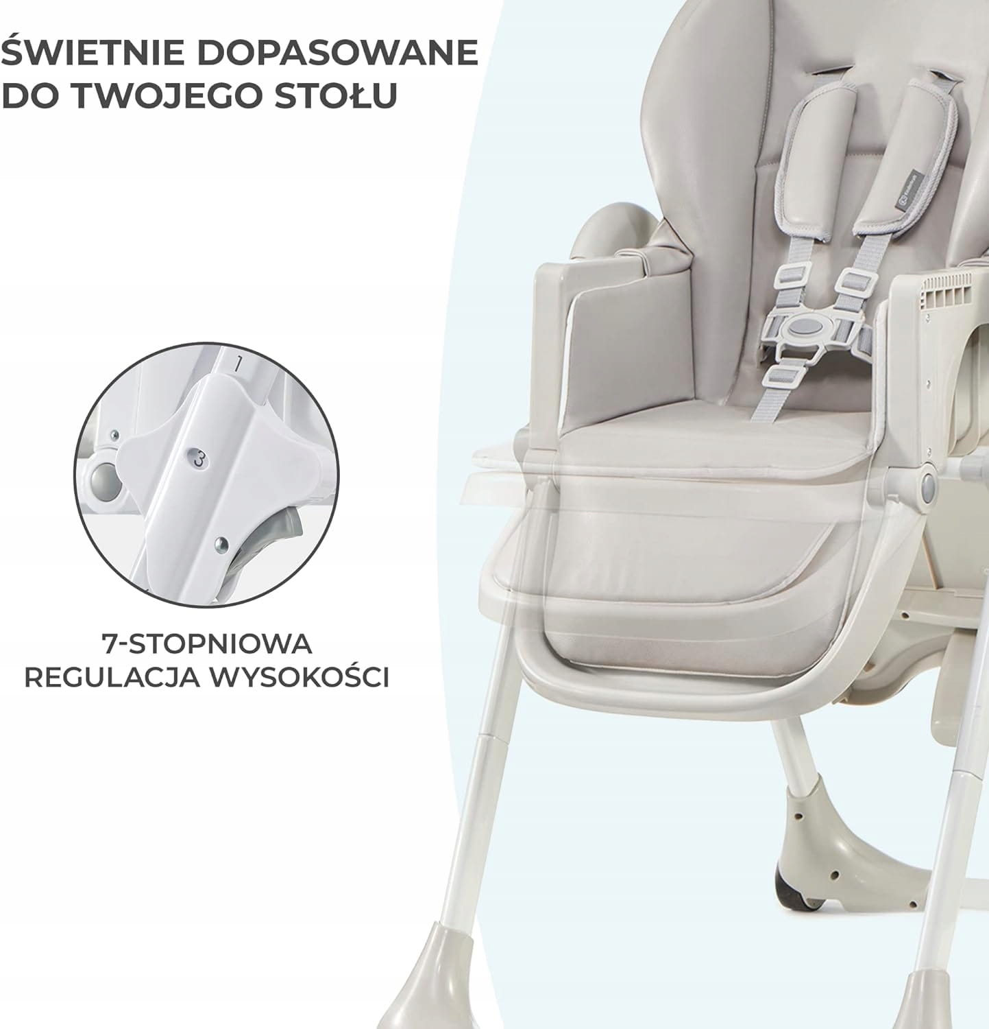 Veľký rozsah nastavenia umožňuje deťom pohodlne používať stoličku, hneď ako sa naučia sedieť. Mäkký poťah z ekokože zabezpečuje pohodlie a ľahké čistenie nábytku.