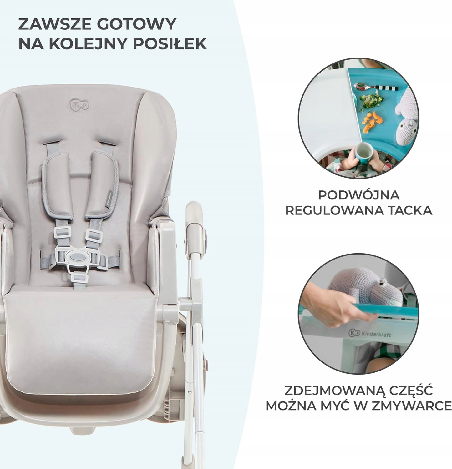 3-bodový, dvojitý, vďaka čomu je podnos ľahko čistiteľný. Umožňuje pohodlné posadenie dieťaťa na stoličku a prispôsobenie vzdialenosti podnosu.