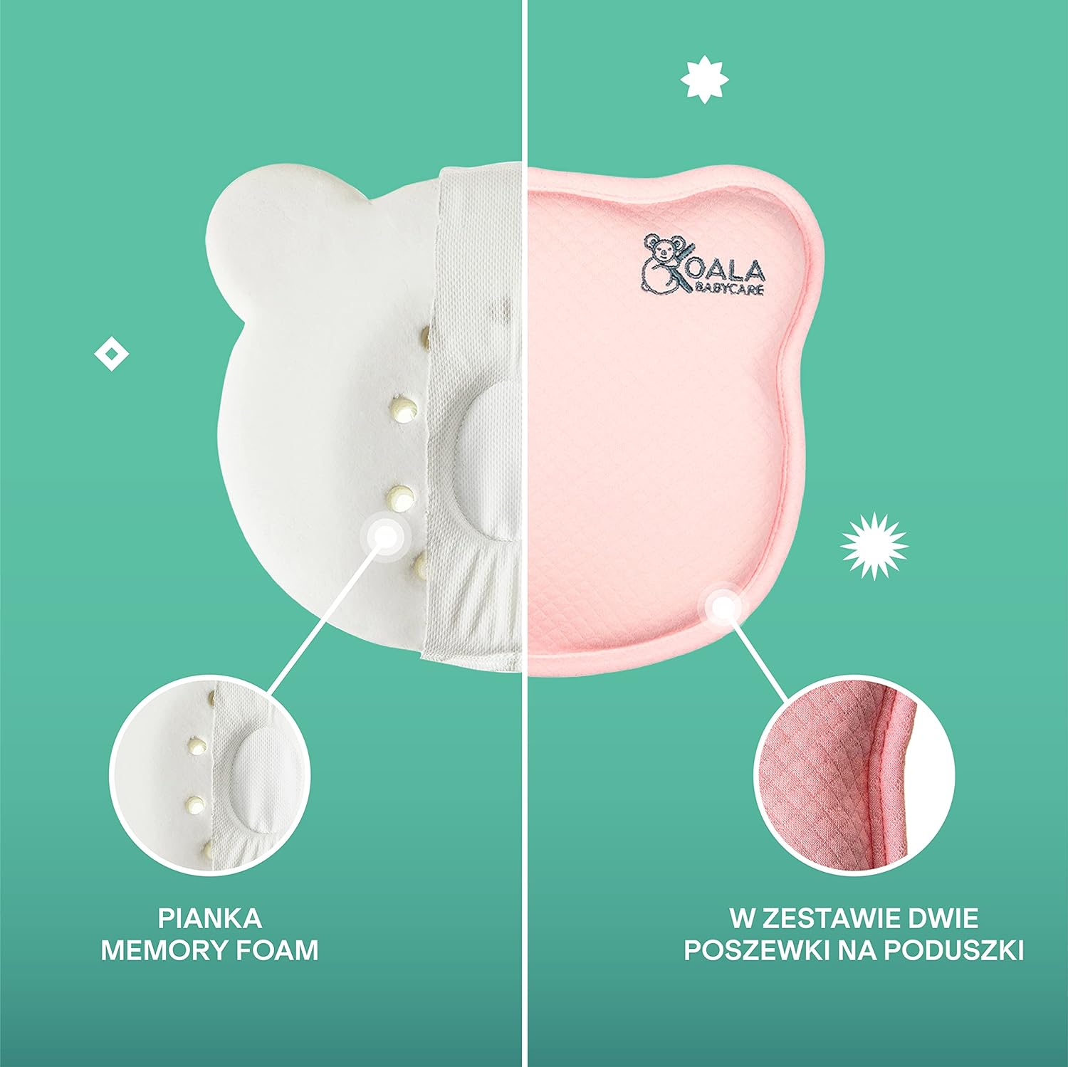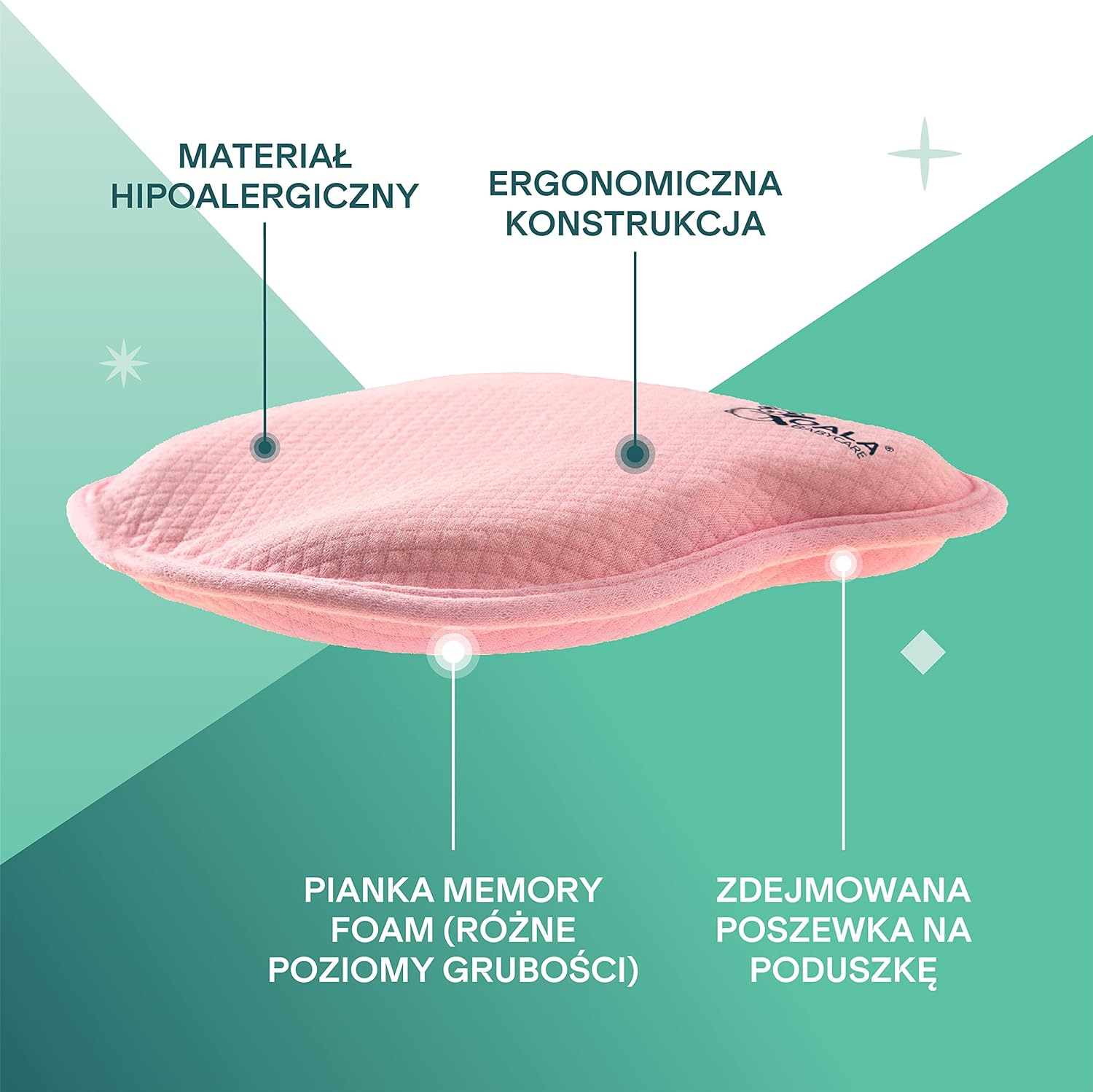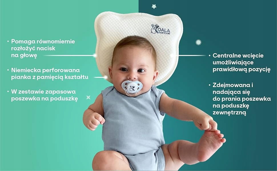 - Ergonomický vankúš pre dojčatá v tvare koaly, ktorý pomáha predchádzať plagiocefálii (bežne známej ako syndróm plochej hlavy). Možno ho používať v nosičoch, autosedačkách, kočíkoch a hojdacích kreslách ako vankúš pre novorodencov, aby sa predišlo plagiocefálii alebo sa korigoval a zmenil tvar hlavičky dieťaťa, ak sa už vyskytuje.