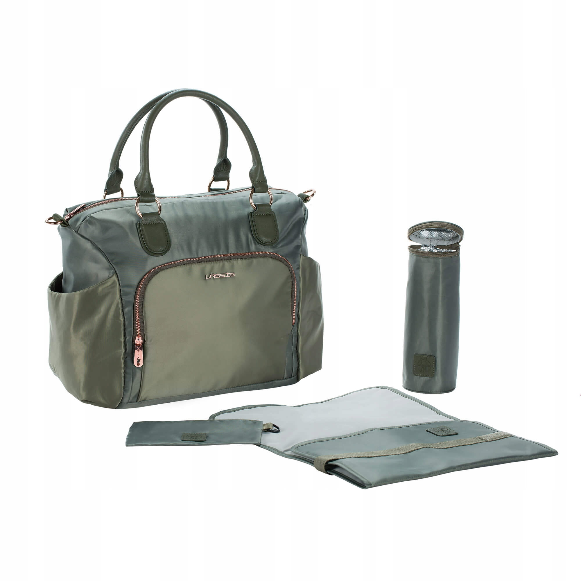 Taška na plienky s priestrannou hlavnou komorou a integrovanou priehradkou na mobil obsahuje praktické príslušenstvo, ako je vodeodolná prebaľovacia podložka, termo držiak na fľašu, vyberateľná priehradka na detskú výživu, vodeodolné vrecko na mokré veci a ďalší nastaviteľný ramenný popruh s nápisom Lassig. Taška na kočík môže byť rýchlo a jednoducho pripevnená ku kočíku alebo nosená na ramene ako štýlová kabelka.