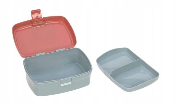 - Box je šikovne rozdelený na hlavnú časť dole, ktorá pojme napr. sendviče, a vyberateľný dvojdielny kontajner na desiatu, napr. nakrájané ovocie alebo oblátky, ktorý možno umiestniť do hornej časti. Box sa dá pohodlne zatvoriť a otvoriť pomocou širokého klipu, ktorý sa sám neotvorí.