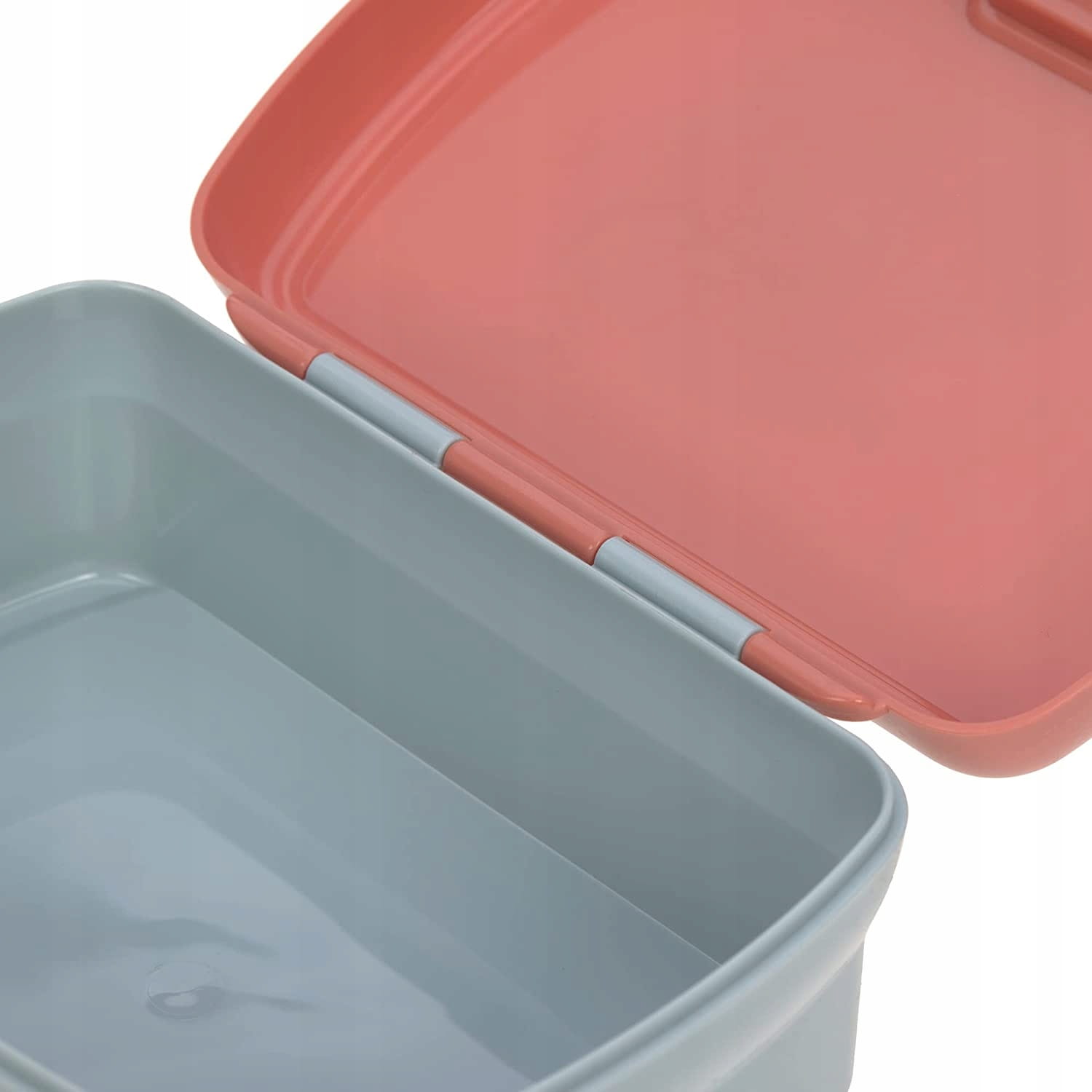- Box je šikovne rozdelený na hlavnú časť dole, ktorá pojme napr. sendviče, a vyberateľný dvojdielny kontajner na desiatu, napr. nakrájané ovocie alebo oblátky, ktorý možno umiestniť do hornej časti. Box sa dá pohodlne zatvoriť a otvoriť pomocou širokého klipu, ktorý sa sám neotvorí. Priehľadná, svetlosivá fľaša má objem 460 ml a je vyrobená z Tritanu™ – moderného materiálu bez BPA. Viečko so športovým náustkom má integrovaný priehľadný kryt, ktorý sa zatvára na klik a zabraňuje náhodnému rozliatiu nápoja, zaručuje hygienu a má protišmykový silikónový pásik uprostred pre jednoduché otváranie.