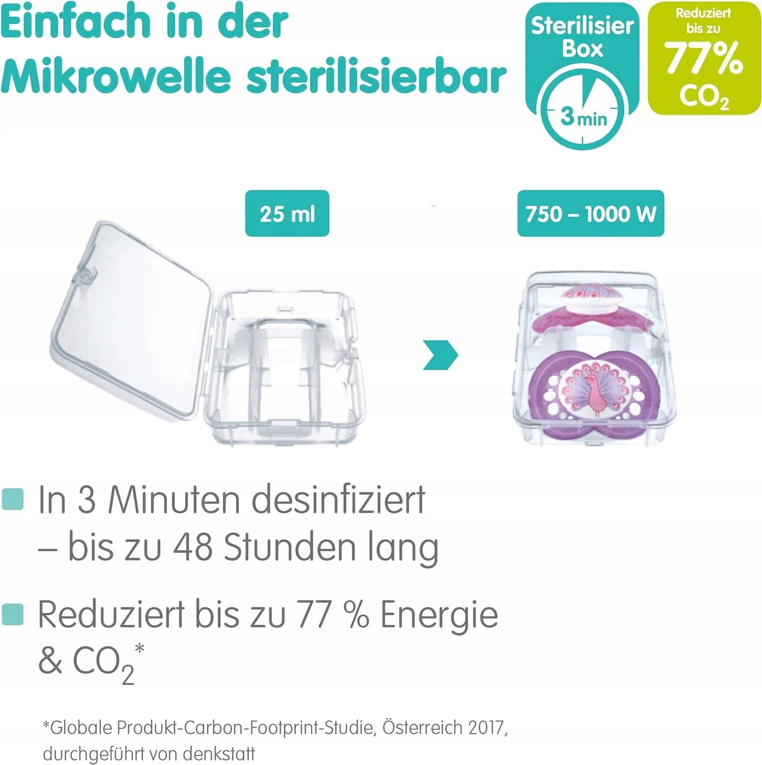 Rýchla a jednoduchá sterilizácia Cumlík MAM Perfect sa predáva v špeciálnej krabičke na skladovanie a sterilizáciu. Stačí naliať vodu, vložiť cumlík a dať do mikrovlnnej rúry na 3 minúty. 100% hygiena!