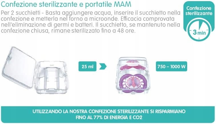 Rýchla a jednoduchá sterilizácia Cumlík MAM Perfect sa predáva v špeciálnej krabičke na skladovanie a sterilizáciu. Stačí naliať vodu, vložiť cumlík a dať do mikrovlnnej rúry na 3 minúty. 100% hygiena!