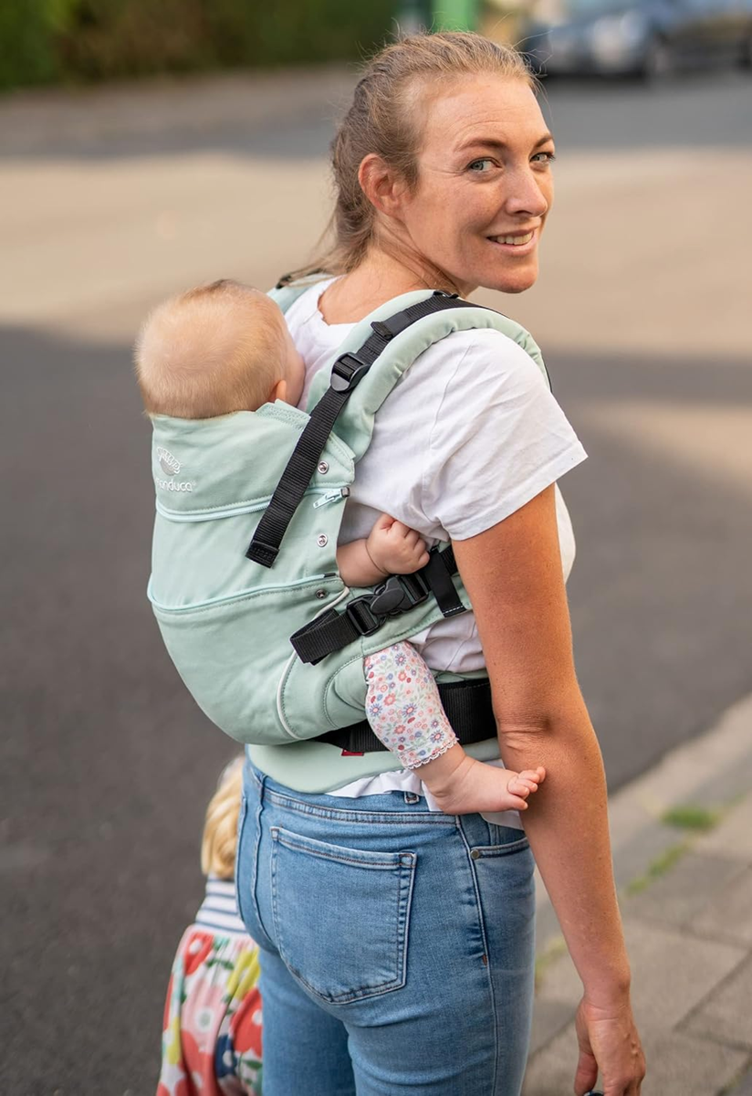 - Bedrový pás rovnomerne rozkladá hmotnosť dieťaťa, vďaka čomu sa nosiaci cíti pohodlne.
