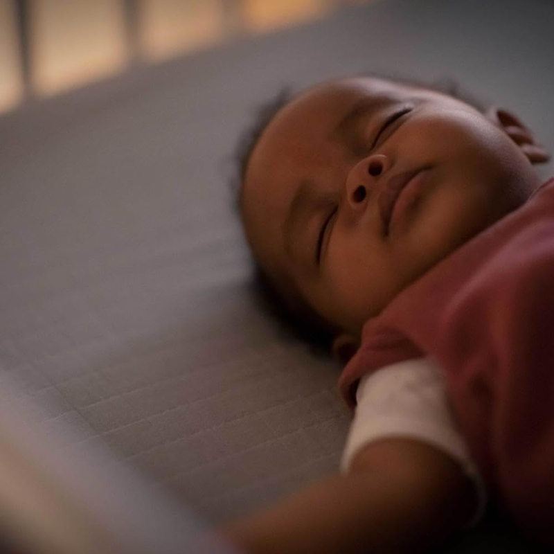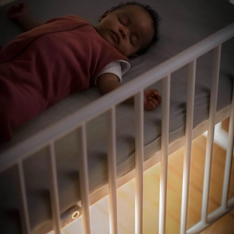 - Na zníženie rizika prebudenia dieťaťa systém detekcie pohybu zapne jemné osvetlenie, keď sa priblížite k postieľke, a vypne ho, keď odídete.