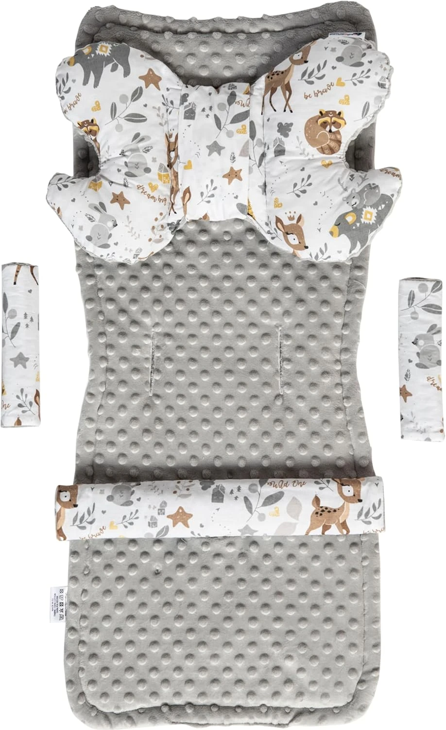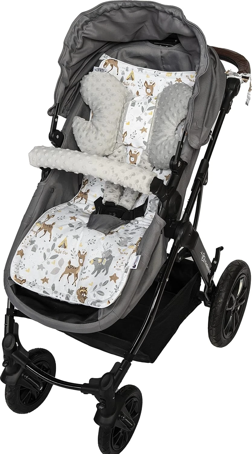 - Obojstranná vložka do kočíka + motýlik + chrániče s antialergickým výplňou vo vnútri. Vložka je určená na sedadlo športového kočíka. Je celoročná. Bavlna na teplé jarné a letné dni, a minky ideálne na jesenné a zimné obdobie. Vložka zlepší dieťaťu komfort cestovania vďaka mäkkej výplni. Chráni tiež poťah sedadla pred znečistením. Skvele sa hodí na dlhé prechádzky a bavlnená tkanina zabraňuje odieraniu. Matrac je vybavený univerzálnymi otvormi na bezpečnostné pásy v rôznych výškach, vďaka čomu pasuje do väčšiny športových kočíkov dostupných na trhu. Tvar vložky bol navrhnutý tak, aby umožňoval jej jednoduchú a rýchlu montáž.