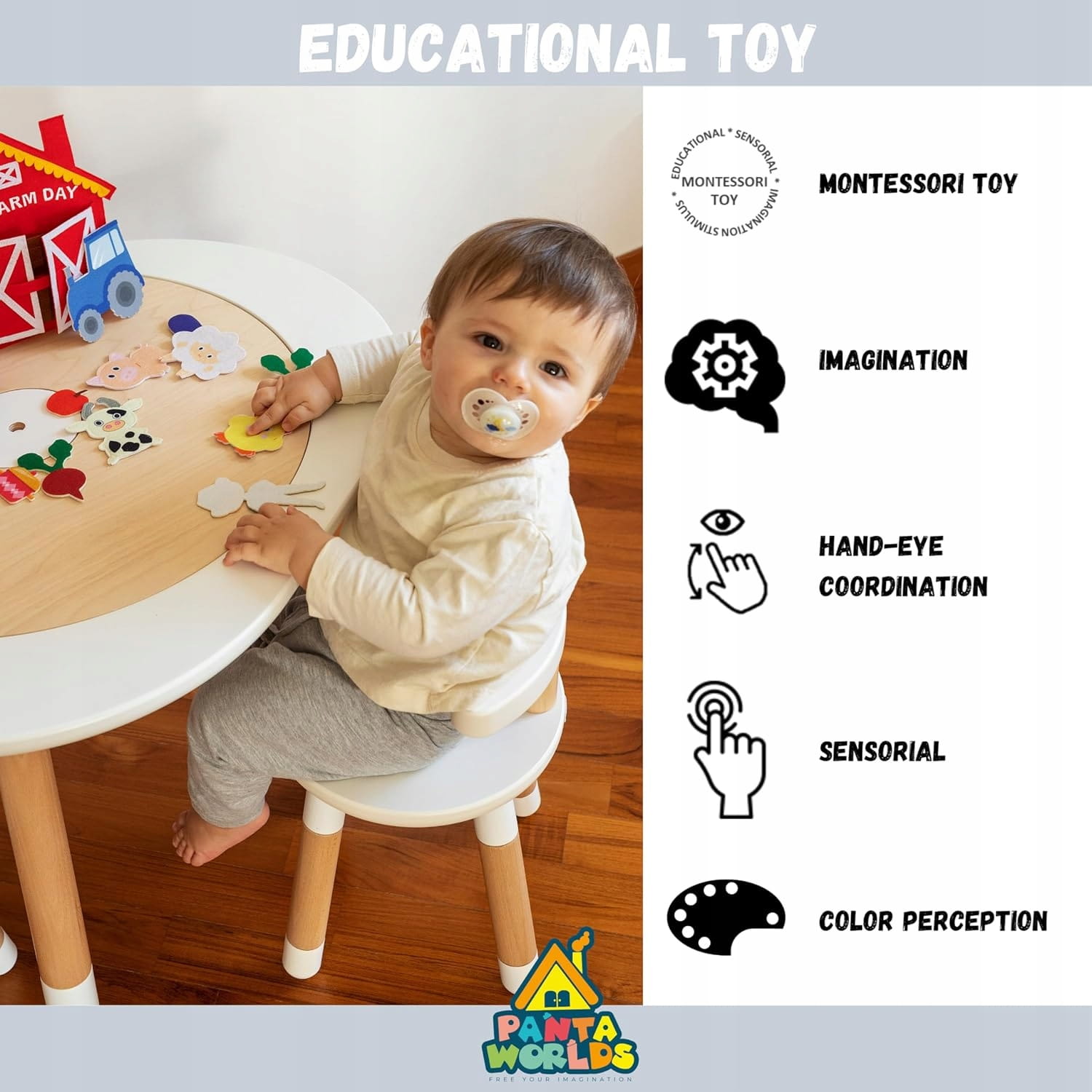 - Rozvíja predstavivosť a hmat, zlepšuje koordináciu ruka-oko, učí farby a tvary.