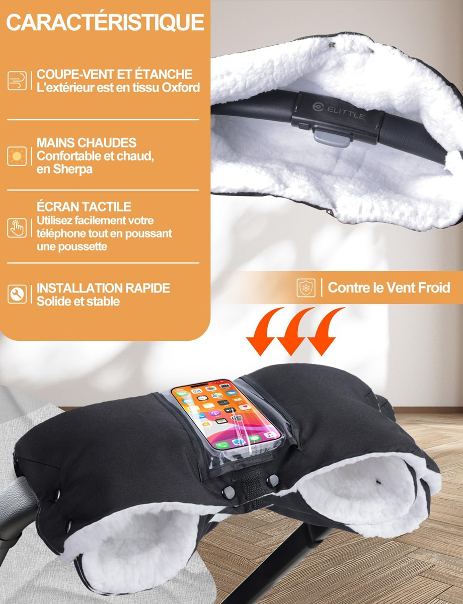 - Odolné a pohodlné. Vonkajšia časť rukavíc na kočík je vyrobená z vysoko kvalitnej vodoodolnej Oxford tkaniny, vetruodolnej, vodoodolnej a odolnej voči snehu, má vynikajúcu tepelnú izoláciu a dlhú životnosť. Špeciálne navrhnutá podšívka z ultra mäkkej Sherpa látky je priedušná a pohodlná, poskytuje vašim rukám maximálny komfort počas dlhých prechádzok, chráni ich pred vlhkosťou a silným vetrom.