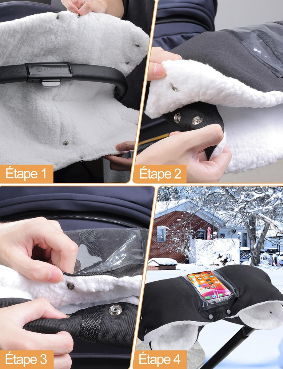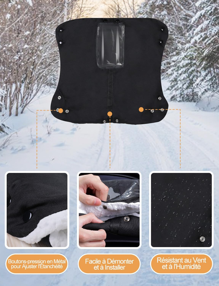 - Rýchla montáž a jednoduché čistenie: kryt na ruky na kočík so zapínaním na cvoky umožňuje pohodlnejšiu montáž a demontáž. Zložte rukavice a pripevnite ich na rukoväť kočíka, potom stlačte všetky gombíky, aby ste ich upevnili. Aj keď je vodoodolný povrch znečistený dažďom alebo snehom, môže byť suchý jemným pretrepaním. Špinu možno odstrániť vlhkou handričkou a prať ručne alebo v práčke.